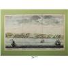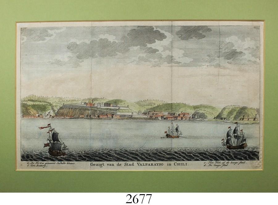Dutch woodcut engraving (1766) by Isaac Tirion entitled "Gezigt van de Stad Valparayso in Chili" showing the port of Valparaiso, Chile, hand-colored. 12-1/2" x 17" (with mat). Beautiful color, a tranquil scene of three ships and the city with various places labeled and keyed in the legend, with creases as usual but otherwise mint condition.