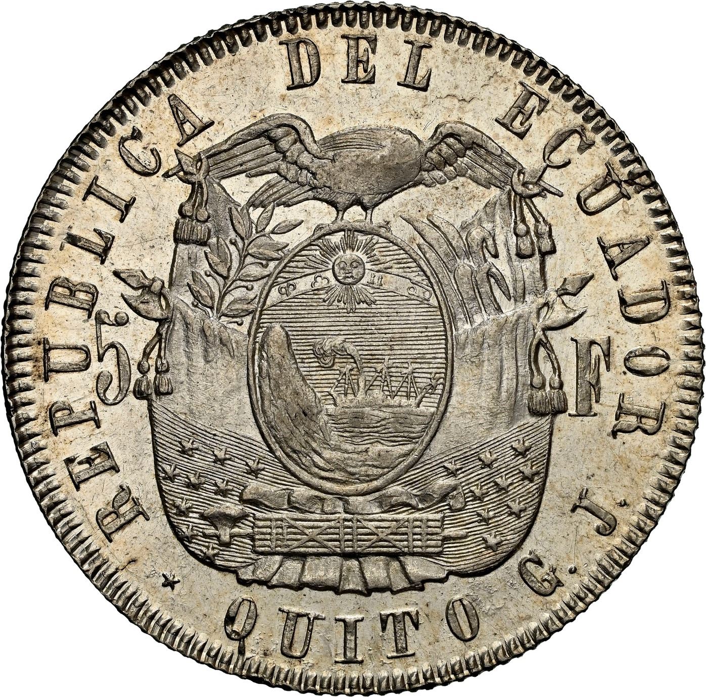ECUADOR, Quito, 5 francs, 1858 GJ, rare, NGC MS 61. KM-39; Seppa-Anderson-73. Proof-like luster with hairlines and very slight high-point flattening in hair, popular with collectors as a rare one-year type that was cut short by a massive earthquake in 1869 and the fact that it circulated at differing rates from 8 to 10 reales.