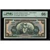 ECUADOR, Quito, Banco Central del Ecuador, 100 sucres specimen, (1930s), series JK, PMG Gem UNC 66 EPQ. Pick-95s. Beautiful Ecuador specimen note with a large central vignette and very colorful underprint, significant paper wave throughout, two punch hole cancellations over the signature spaces.