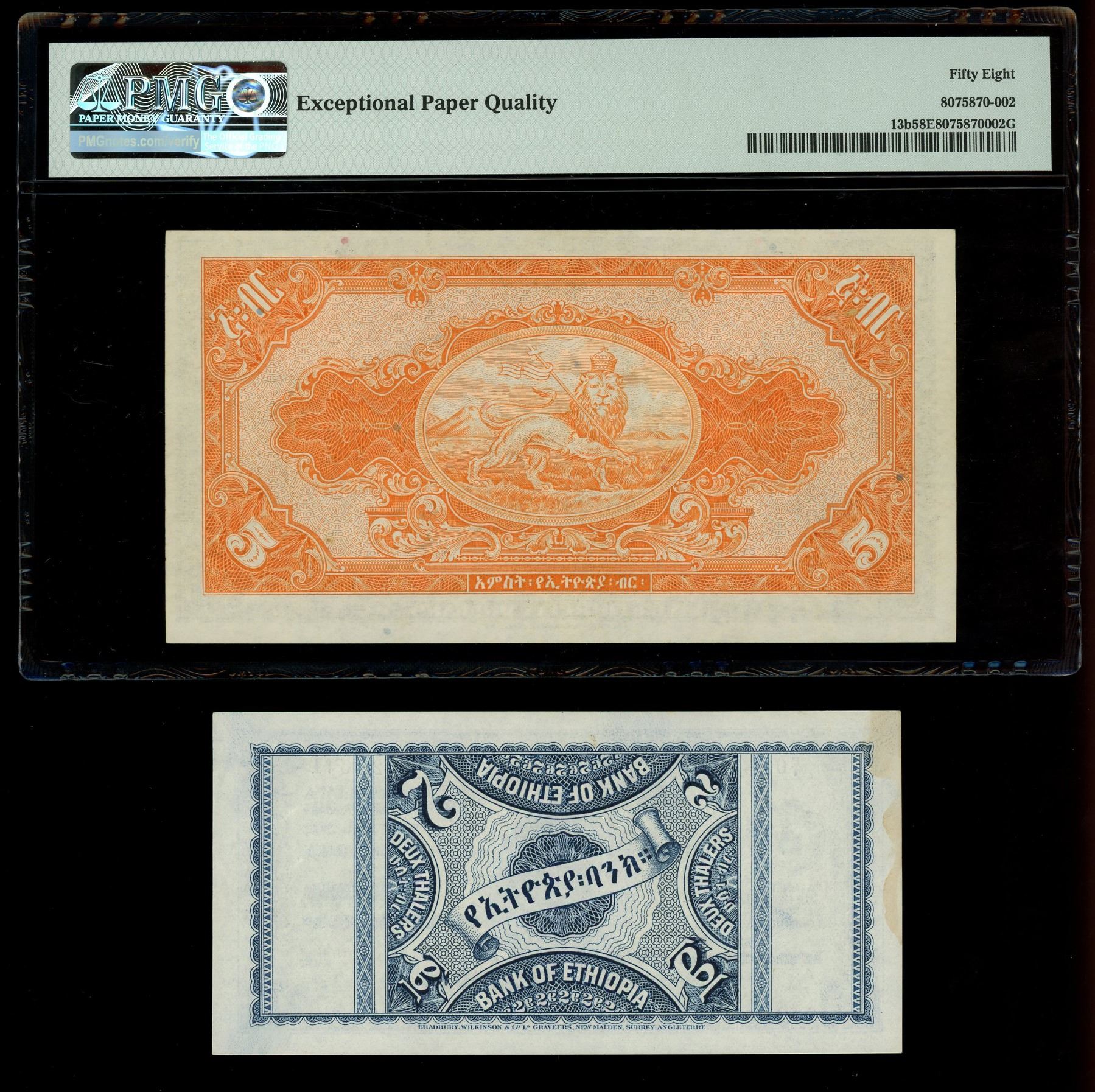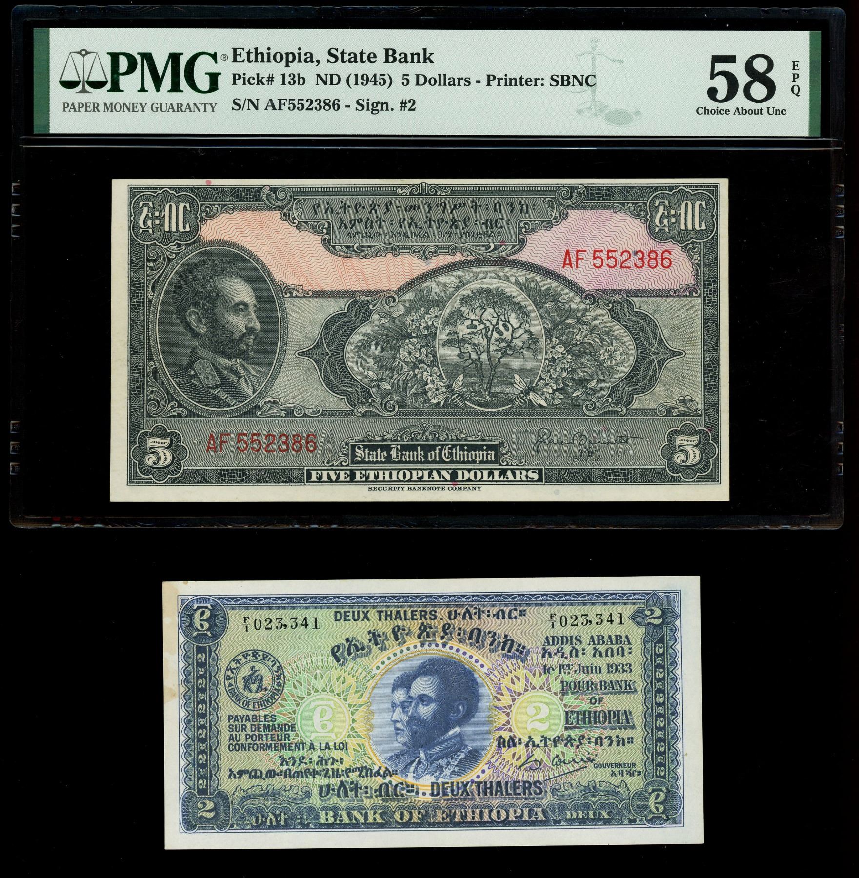 ETHIOPIA, lot of three notes: 2 thalers, 1-6-1933; 5 dollars, (1945), PMG Choice AU 58 EPQ; 1 dollar, (1945), PMG Choice AU 58. Pick-6, 13b, 12b. All well-printed notes with colorful inking, each with some minor handling, light stains noted in the margin of the 1933-dated 2 thalers.