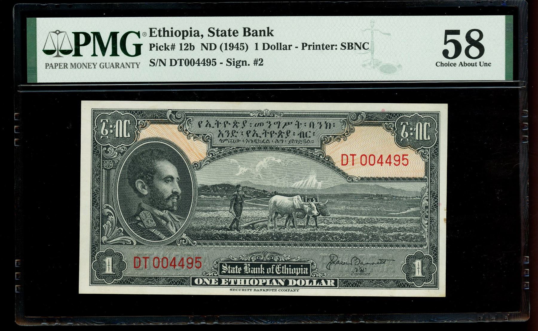 ETHIOPIA, lot of three notes: 2 thalers, 1-6-1933; 5 dollars, (1945), PMG Choice AU 58 EPQ; 1 dollar