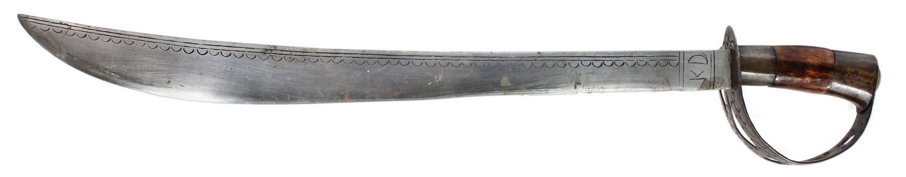 Early 1800s Spanish colonial naval cutlass. 833 grams, 24" long, 19" blade. Officer or gentleman sailor's cutlass with hand-forged, well-crafted bolo-style blade with blood grooves and engraved decorations along with owner's initials "PD" and "KD" on either side, D-guard iron hilt with piercings and incised punched decorations, wooden grip with brass stud inlays, fine condition and minimal age toning, blade still bright. With photo-certificate.