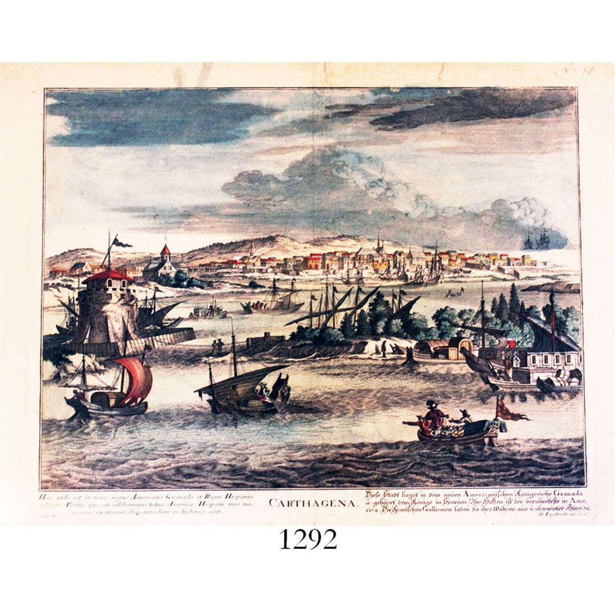 Early 18th-century German copper-plate engraving of Cartagena, Colombia, by Martin Engelbrecht (1684-1756), hand colored. 17-1/2" x 12-3/4". Fine engraving showing the city with small fortress and chained harbor with small boats in foreground, La Popa hill in the background, colored in blue-green and red (with some of the blue bled into the top margin), nice condition with old repair at top.