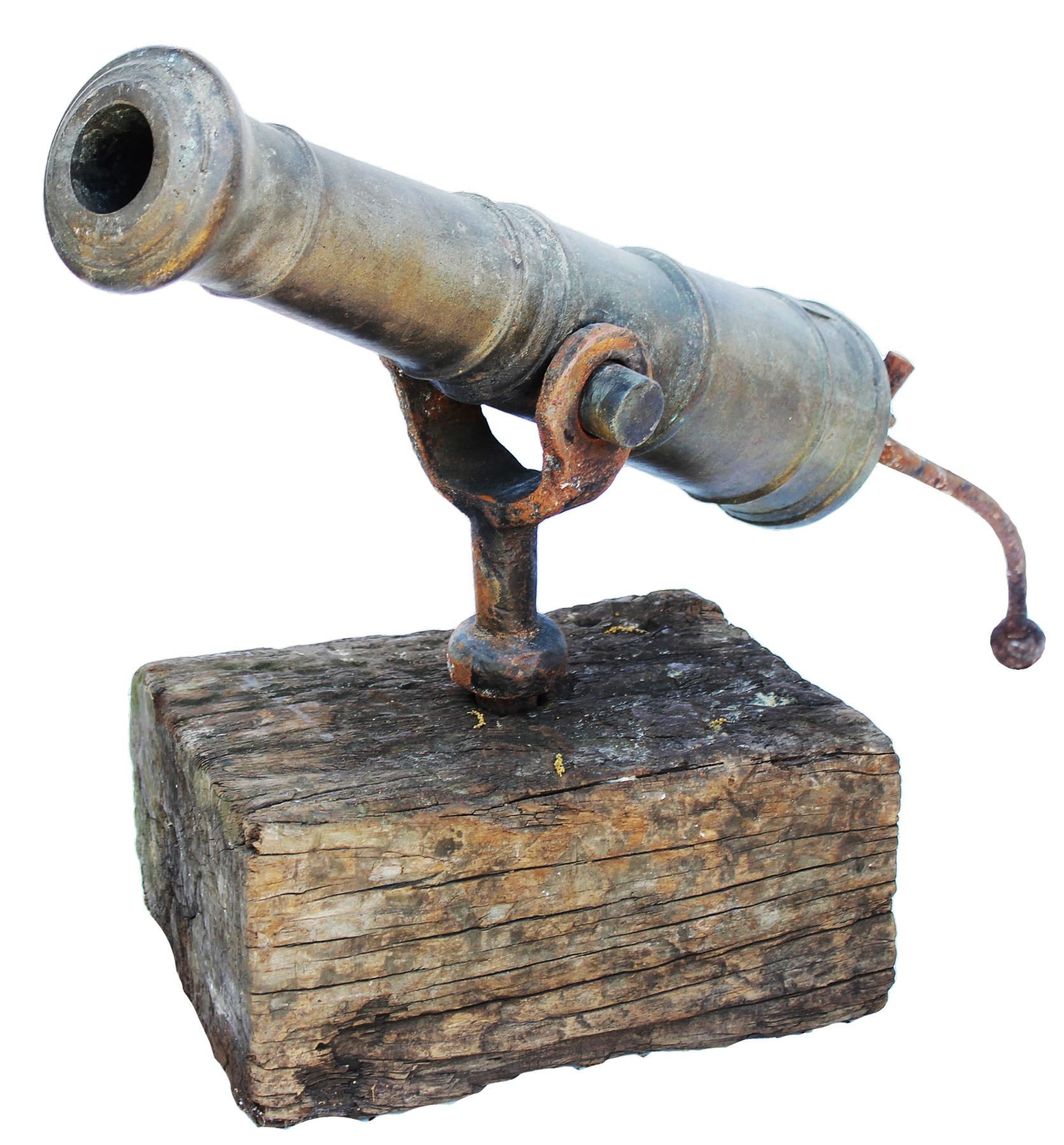 Early 19th-century American bronze swivel-mount cannon with iron tiller. 23" long, 5" diameter at breech, 4" muzzle, 1-2" bore, approx. 63 lb. Plain cast-bronze well-patinated cannon of classic, ring-turned design in a compact size with rounded cascabel, hand-forged iron swivel mount with pintle, detachable 16" forged-iron pointing tiller with ball end, all mounted on a 13" x 8" x 6" plain block of oak for display. This type of cannon was used as a rail gun on early sailing ships, possibly in the Oyster Wars between Maryland and Virginia. From a Kilmarnock, Virginia estate. (Special shipping required.) With photo-certificate.