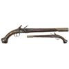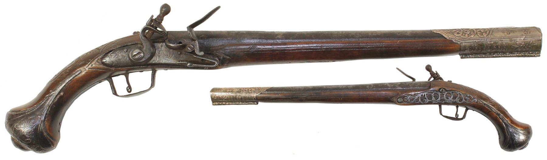 Early European flintlock pistol, 1700s. 1158 grams, 21-1/2" overall length, 14-3/4" barrel length. Longer tapered-barrel pistol with simple decorations engraved on barrel, ornate and well-worn silver nosecap, simply carved old walnut stock, ornate pierced steel sideplate, steel escutcheon and trigger guard, complete and functioning lock, and missing ramrod. Overall good condition with usual minor nicks and some small repairs. With photo-certificate.
