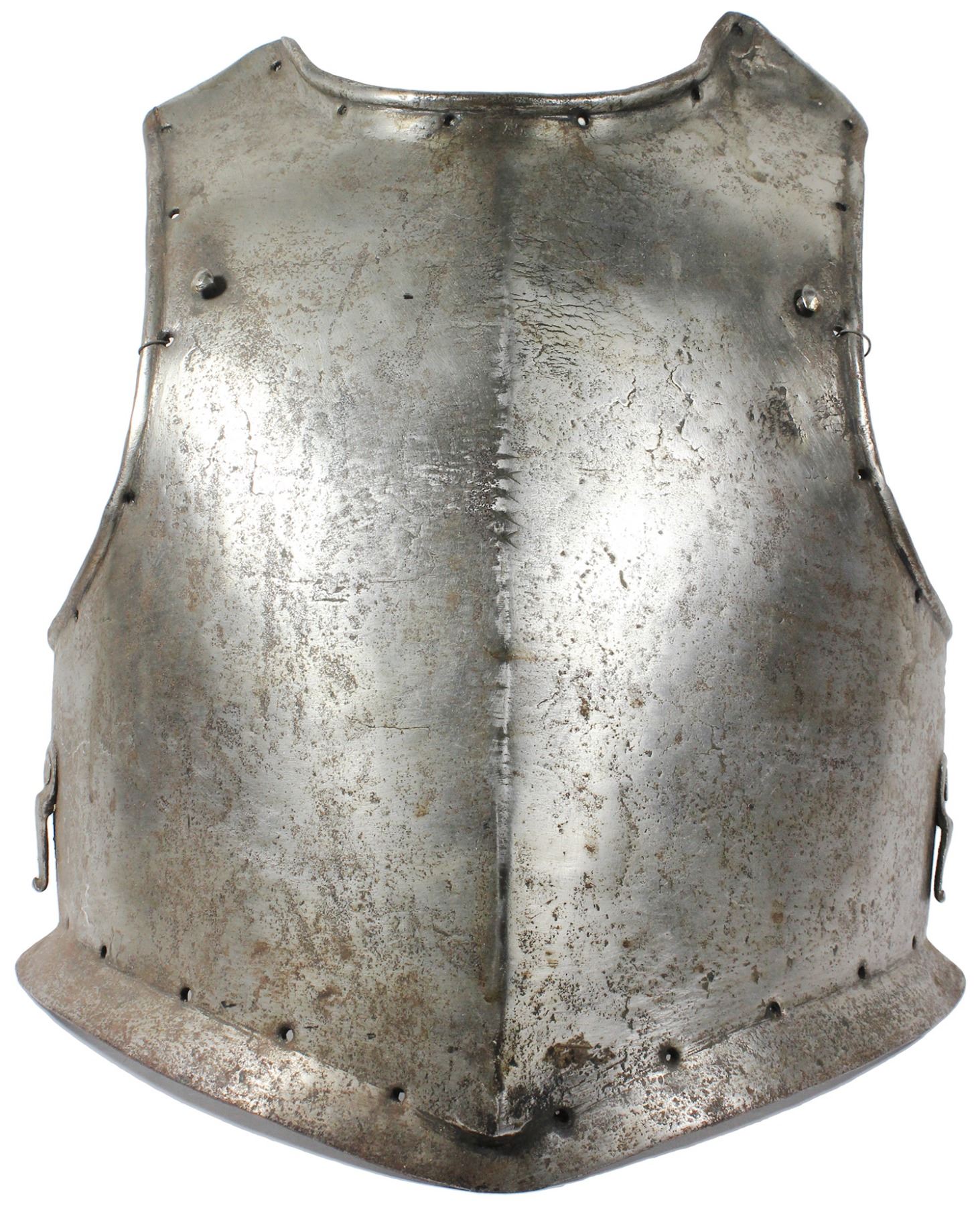 Early European siege-weight soldier's breastplate, 1600s. 3470 grams, 17" tall x 13-1/2" wide. Heavy hand-forged construction with folded-over edge-rim, pronounced medial ridge (with a series of X marks in center and small AT at top), two studs for suspension hangers and small holes on edges for attaching liner, two belt hooks riveted at sides, possibly from Amsterdam based on marks, front mostly cleaned bright with light pitting and age toning, back with blackened dark patina and original hammered surface, found in a barn in Nottingham, England in 1985. With photo-certificate.