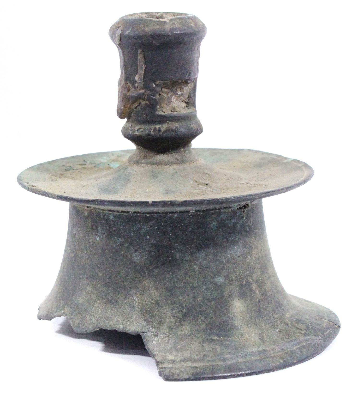 Early Spanish capstan candlestick, 1500s-1600s, from an unknown Spanish wreck site. 723 grams, 5" tall, 5-1/2" diameter at base. Unusual southern Caribbean candle form, uncleaned and heavily encrusted, green patination all over, half of base missing but still serviceable. With photo-certificate.
