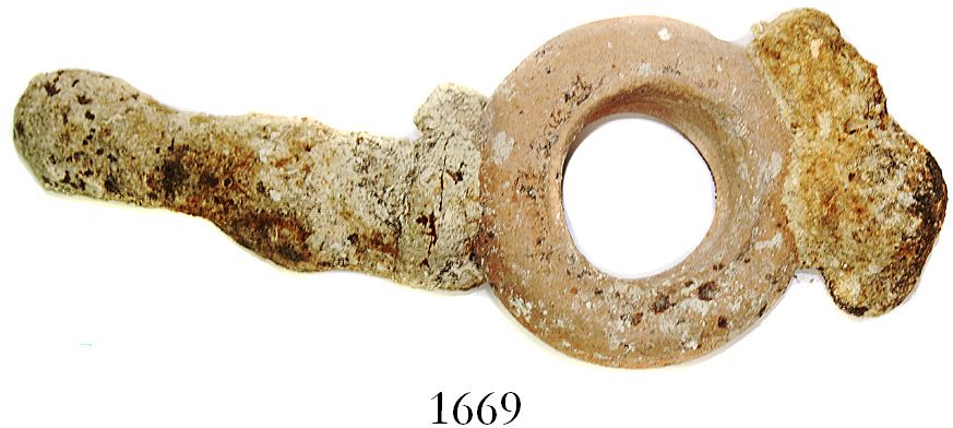 Earthenware "olive"-jar neck and spike encrusted together. 923 grams, roughly 10-1/2" x 4" x 2". The neck is complete and typical, with knob on one side and long protusion opposite that are the encrusted (cocooned) remains of an iron spike, very nice for display. With Global Marine Exploration photo-certificate #SW0036. Recovered from: Unidentified 1500s-1600s wrecks off Santo Domingo