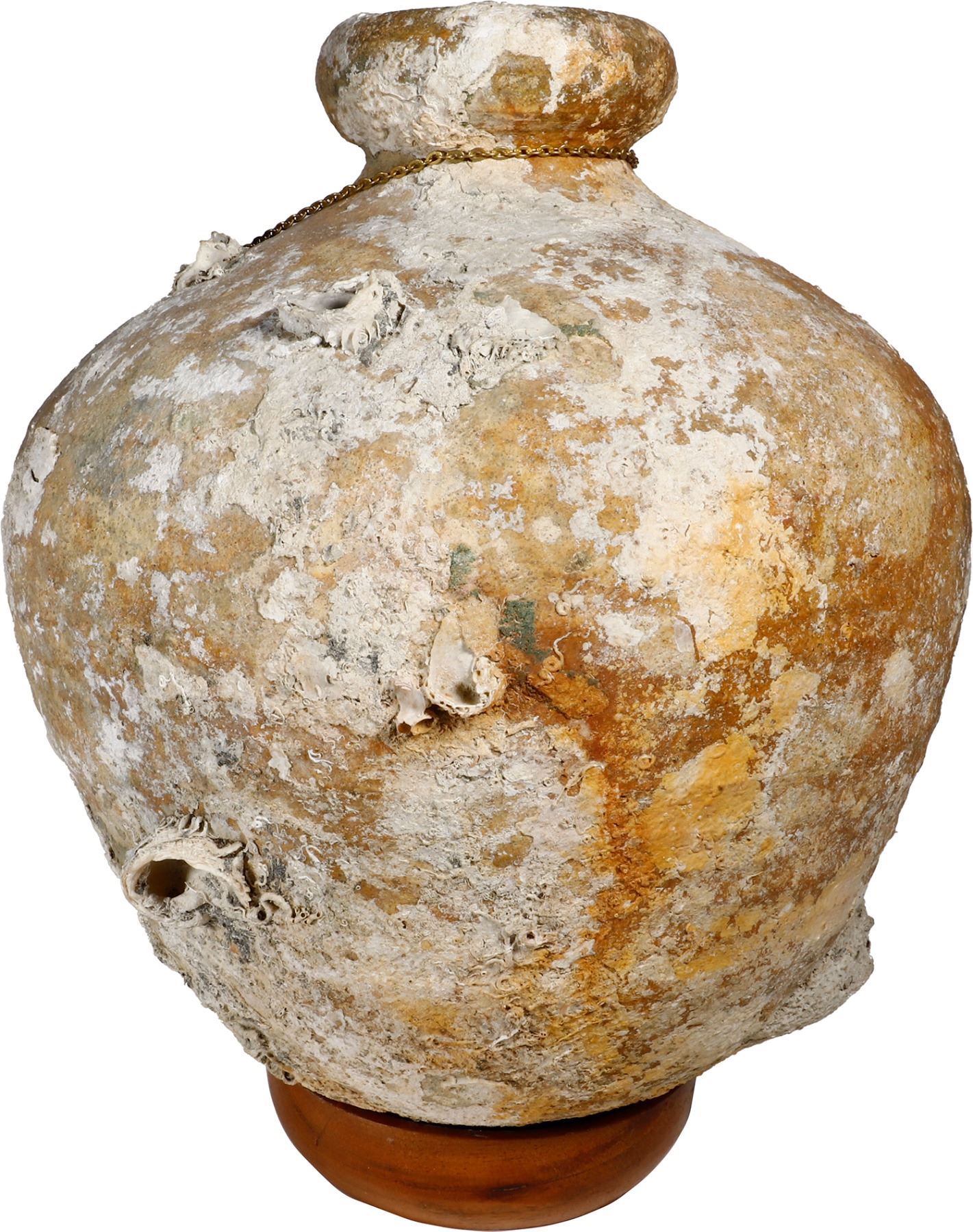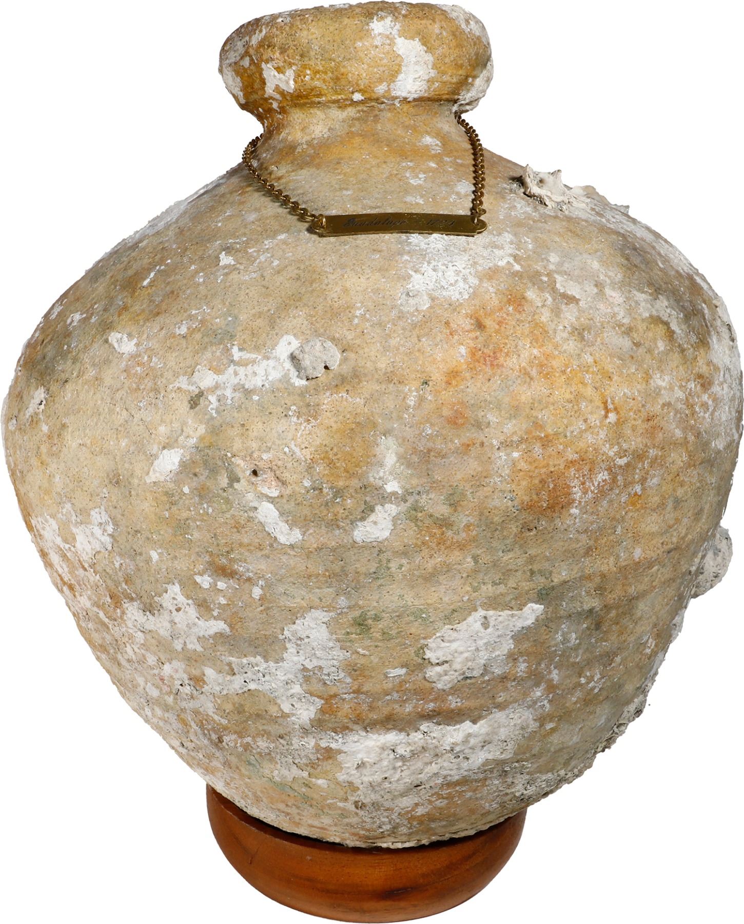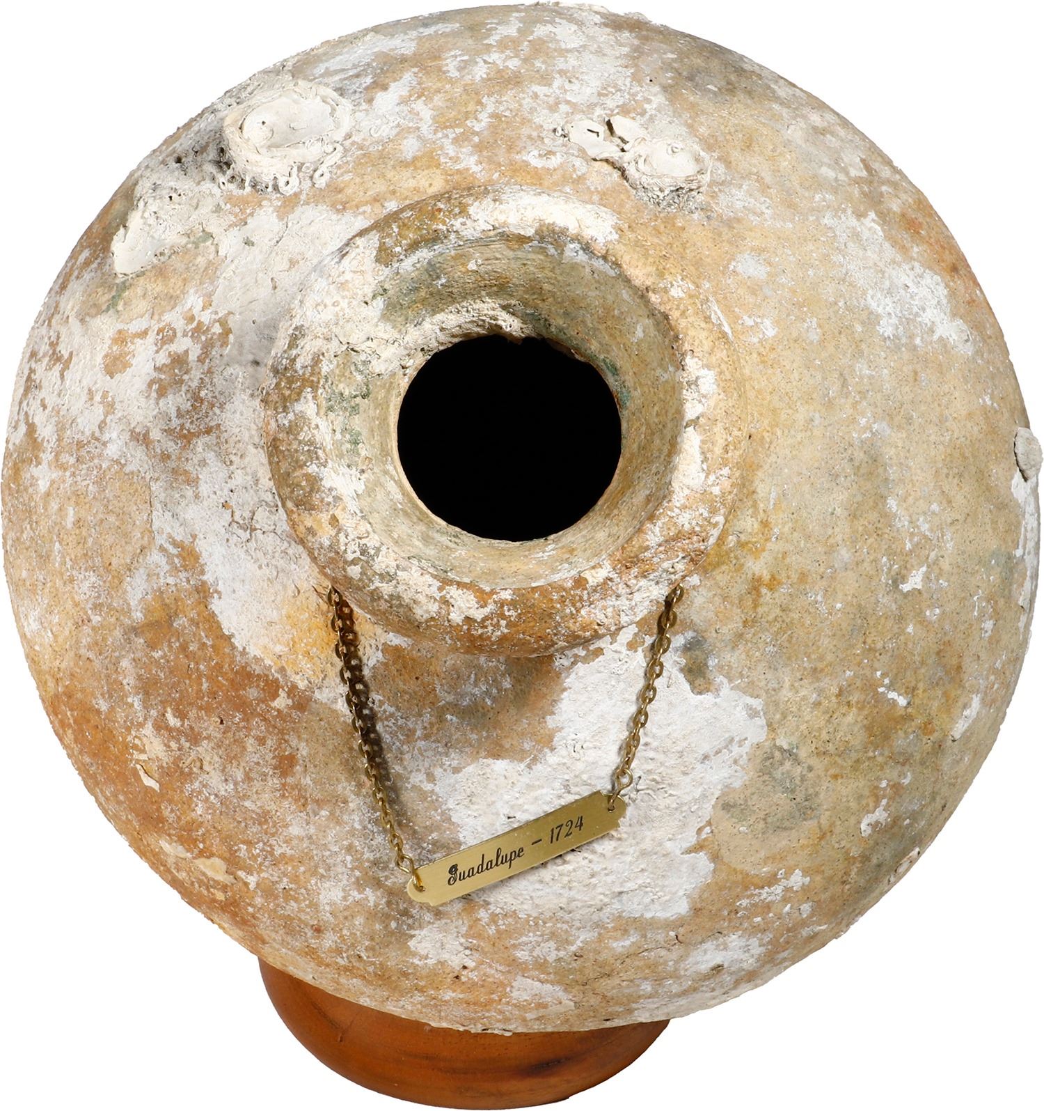 Earthenware "olive" jar with wooden stand, ex-Guadalupe (1724). 8.3 lbs (3769 grams) total. Roughly 10½" tall, 9" at shoulders. Intact beehive olive jar with rounded bottom, visible ring-turned design around body, large rolled lip, bits of encrustation all over including coral and shells (and a loose shell inside too), and light-orange appearance, with metal chain and tag stating that it came specifically from the Guadalupe site. Pick up recommended; special shipping costs apply. From the Guadalupe (1724), with original certificate from Captain Tracy Bowden through his contract with the Dominican Republic and copy of the article "Graveyard of the Quicksilver Galleons" by Mendel Peterson from the December 1979 issue of National Geographic.