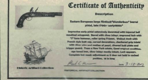 Eastern European large flintlock blunderbuss barrel pistol, late 1700s-early 1800s. 1129 grams, 16" long, 10" barrel, 1" muzzle. Impressive early pistol extensively decorated with tapered bell-mouthed silver-inlaid octagonal barrel, engraved lock with "S" form hammer, roller spring frizzen, walnut stock with French-style butt cap, carved decorations, checkered silver and mother-of-pearl inlaid grip, and silvered buttplate and trigger guard. Good original condition with silver inlays mostly intact and apparent complete lock needing adjustment to hold in cocked position. With photo-certificate.