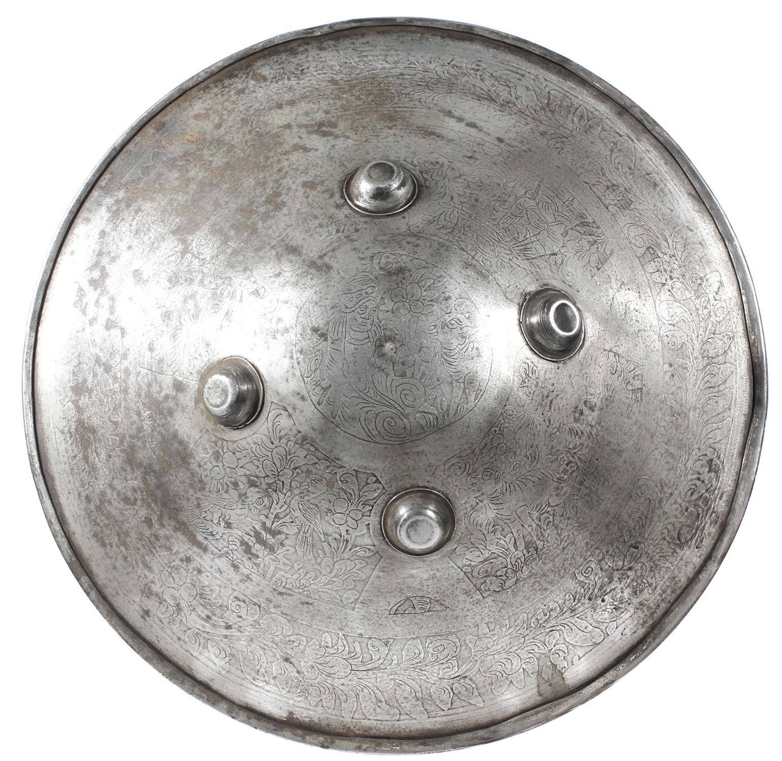 Eastern European steel war shield, 1700s. 1980 grams, 18-1/2" diameter. Ornately engraved and well-worn shield featuring pastoral scenes of animals, vegetation and people (a strange juxtaposition for its use in battle), four raised studs on front (to camouflage screwed-in carrying rings from other side), back with portion of old leather liner, good condition with numerous small dents, rusted patches, fine pitting and somewhat cleaned. With photo-certificate.