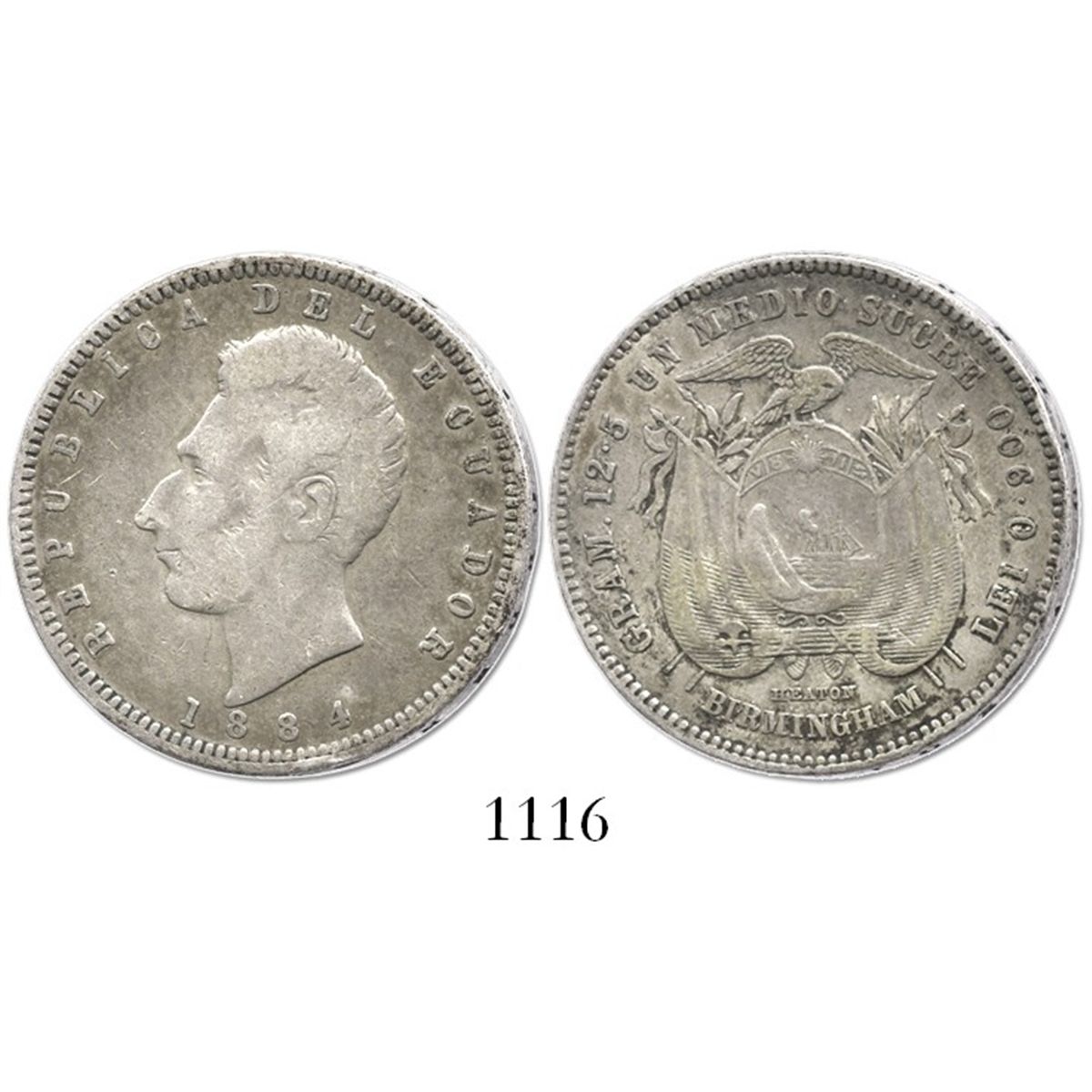 Ecuador, 1/2 sucre, 1884-HEATON BIRMINGHAM. KM-52. 12.2 grams. Toned VF with minor rim-flaw below date.