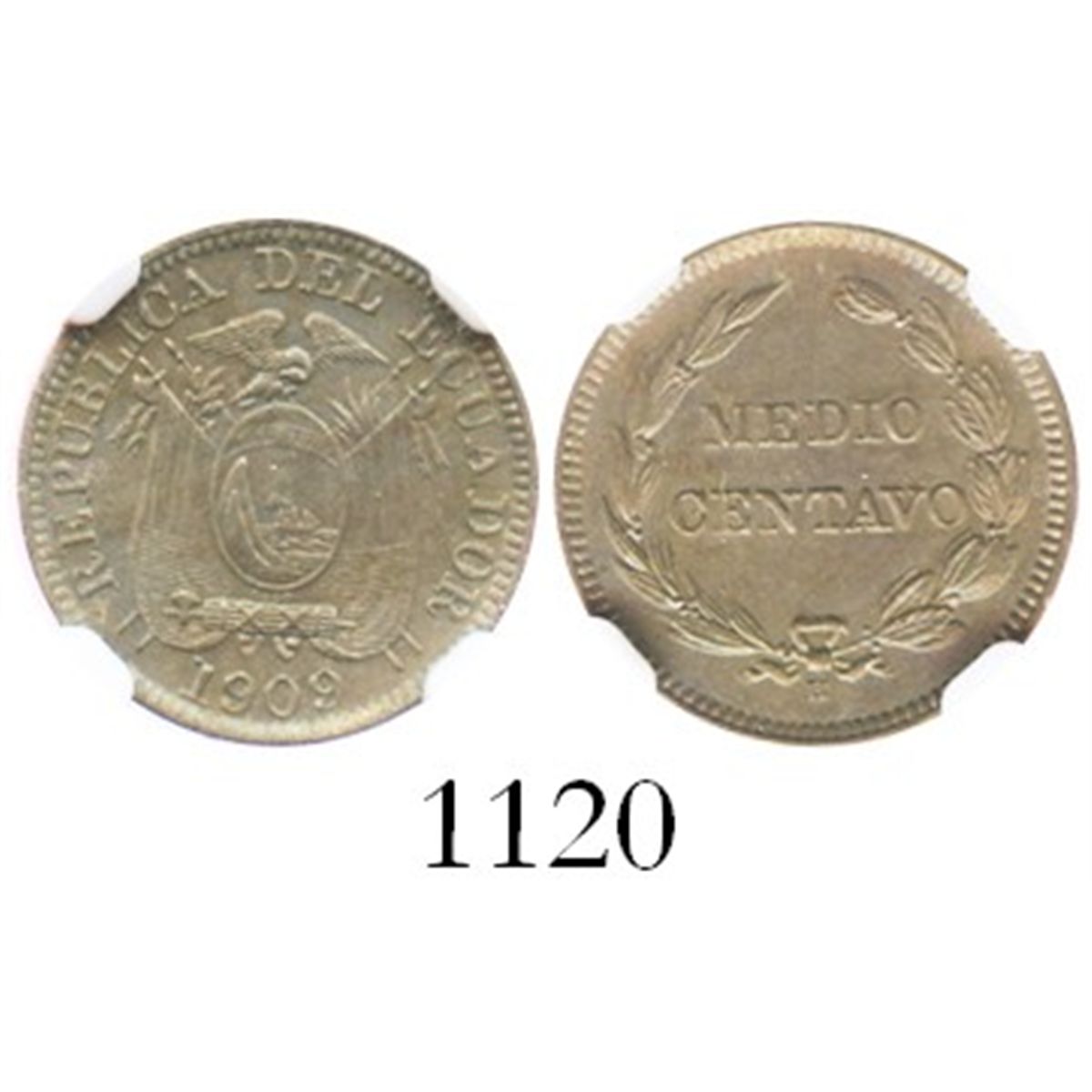 Ecuador, copper-nickel 1/2 centavo, 1909-H (Heaton), encapsulated NGC AU details / surface hairlines