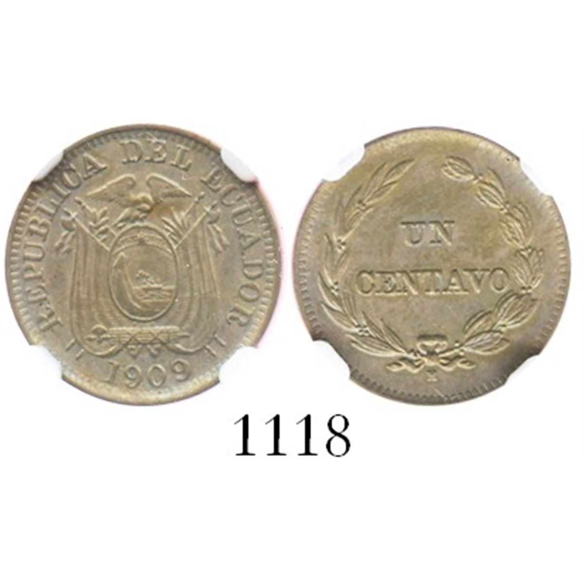 Ecuador, copper-nickel 1 centavo, 1909-H (Heaton), encapsulated NGC AU details / surface hairlines.