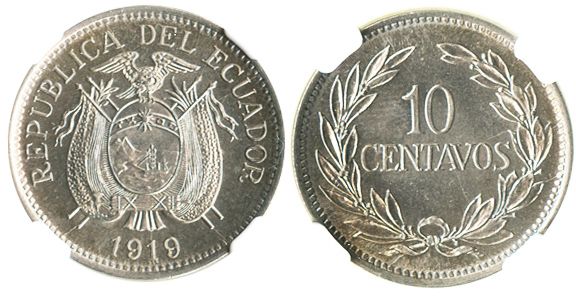 Ecuador, copper-nickel 10 centavos, 1919, encapsulated NGC MS 66, finest known specimen graded by NGC. KM-64. Prooflike BU with choice luster, no wear or marks, the best example on record.