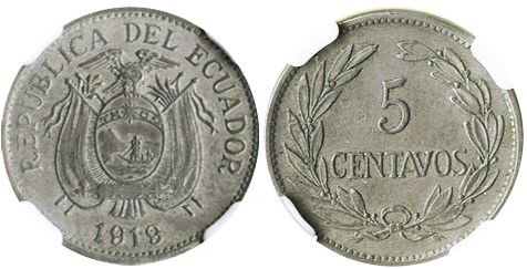 Ecuador, copper-nickel 5 centavos, 1919, 4 berries, encapsulated NGC AU details / environmental damage, rare. KM-63. Slightly dull surfaces from excessive toning (not really "damaged"), good strike with barely discernible wear on high points only, better variety according to KM.