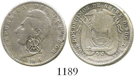 Ecuador (struck at Philadelphia), 2 decimos, 1895TF-PHILADELPHIA, with monogrammed-RA countermark (G