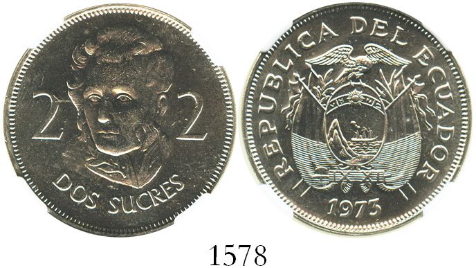 Ecuador (struck in Germany), copper-nickel 2 sucres, 1973, encapsulated NGC MS 65. KM-82. Superb luster (very flashy), minimal marks on reverse only.