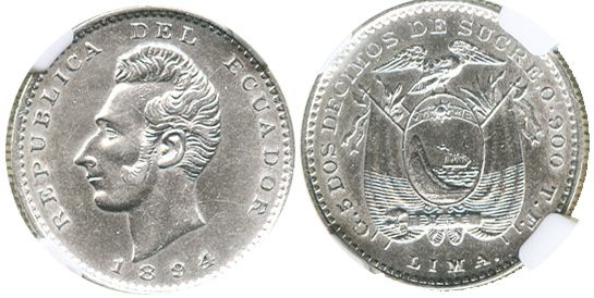 Ecuador (struck in Lima, Peru), 2 decimos, 1894/89TF-LIMA, encapsulated NGC AU 53, finest (and only) known specimen graded by NGC. KM-51.3. Lustrous and choice but with very light surface hairlines on obverse.