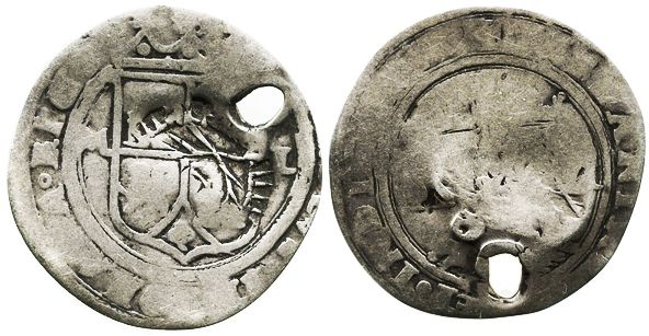 El Salvador, 1 real, arms countermark (Type V, 1868) on a Mexico City, Mexico, 1 real, Charles-Joanna, "Late Series," assayer L to right, mintmark M to left. KM-50. 2.4 grams. Very worn host as usual (AVG) but with details still clear (even much of the legends) and with contrasting toning, the countermark a bit weak but recognizable, crude old hole at edge.