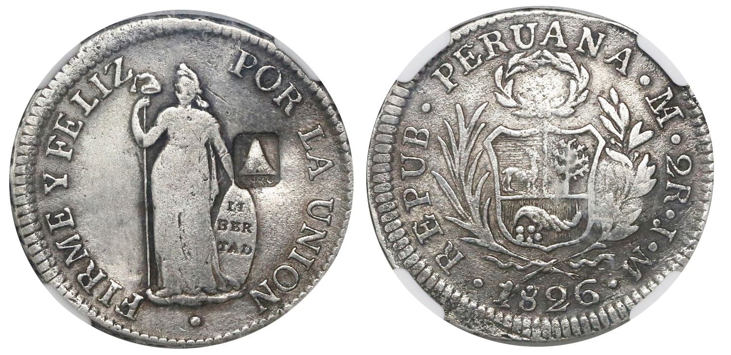 El Salvador, 2 reales, volcano / 1839 countermark (Type III, variety with 3 over retrograde 3) on a Lima, Peru, 2 reales, 1826JM, rare, NGC VF 20. KM-36. Toned around details, weak Liberty as usual but otherwise bold, crude rims (as made), the usual test-scrape to left of Liberty very light on this example, tied with one other for finest (and only) known in NGC census. NGC #2803448-003. Pedigreed to the Ponterio auction of November 2009 (lot 9149).