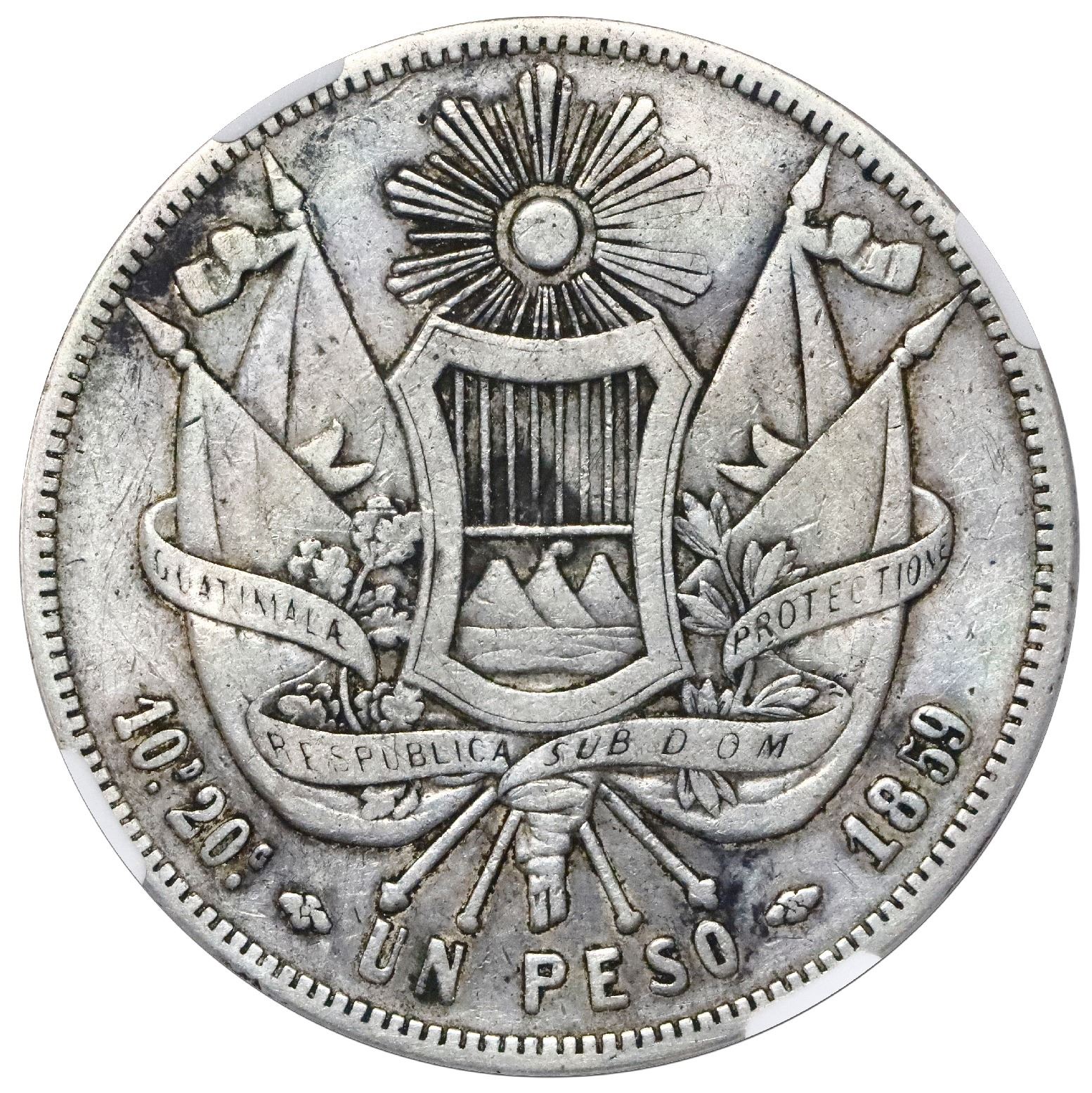 El Salvador, 8 reales, R-in-beaded-circle countermark (Type IV, 1862) on a Guatemala 8 reales 1859 R, very rare, NGC VF 30, c/s XF standard. KM-99. 24.38 grams. Full countermark on a lightly worn host with contrasting toning in crevices, one of three at the VF level at NGC that are technically tied for second finest behind a single AU 53. The El Salvador Type IV-countermarked 8 reales is one of the great crown-sized rarities of Latin America, with reportedly only five pieces known, none having crossed the auction block in recent decades, hence the current example is an important opportunity and worth pursuit by astute collectors. NGC #5965629-013.