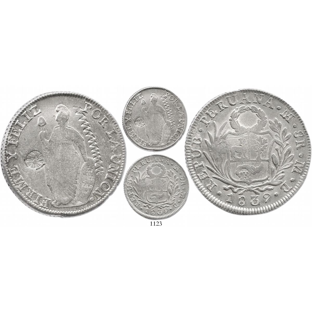 El Salvador, 8 reales, zigzag test mark (1834-5) and Guatemala sun-over-mountains countermark (Type II, 1839) on a Lima, Peru, 8 reales of 1839MB, plate coin in de Mey, very rare. KM-unl. 27.7 grams. Lightly toned AVF host with small edge-flaw, with bold countermarks in fields flanking Liberty, the zigzag mark particularly rare. For comparison, a similar countermark combination on a 2R sold for $2090 this year (Heritage CICF, lot 25864), but the 8R is definitely much rarer. Plate coin #1088 in J.R. de Mey's Les contremarques sur les monnaies (1982), and pedigreed to UBS sale #45 (1998), lot #3167.