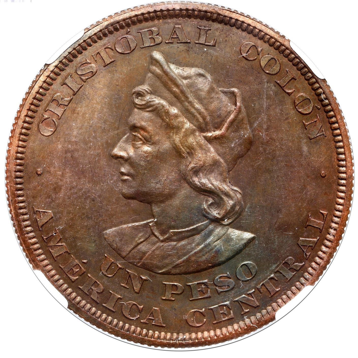 El Salvador, copper pattern 1 peso (off-metal strike), 1893 CAM, reeded edge, Columbus, NGC PF 62 Brown. KM-Pn38. Dark brown with rainbow overtones, faint surface hairlines (as made), second finest in the current NGC census behind a single MS 63, interesting second-year pattern of a popular multi-year design originally struck to commemorate the 400th anniversary of Columbus' discovery of the Americas.