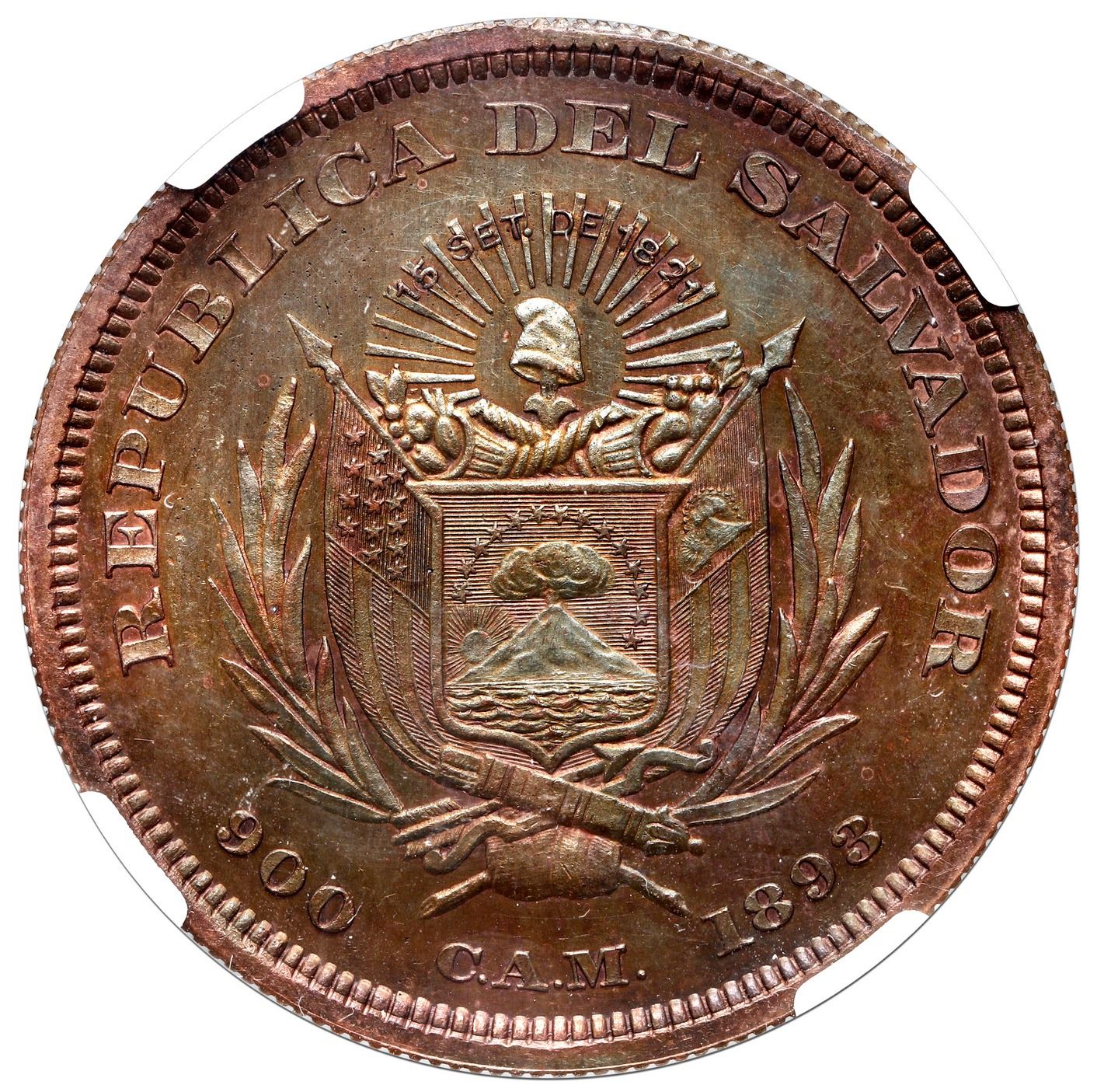 El Salvador, copper pattern 1 peso (off-metal strike), 1893 CAM, reeded edge, Columbus, NGC PF 62 Br