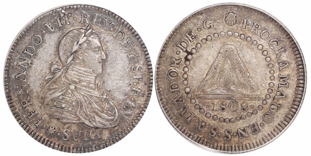 El Salvador, silver 1R-sized proclamation medal, Ferdinand VII, 1808, encapsulated ANACS AU 50. 21mm. Attractively lightly toned with underlying luster, a very elusive and popular circulating proclamation medal struck in San Salvador when it was part of Guatemala, seldom seen in this high quality. Pedigreed to the Dana Roberts collection via Roberto Ulloa of El Salvador.