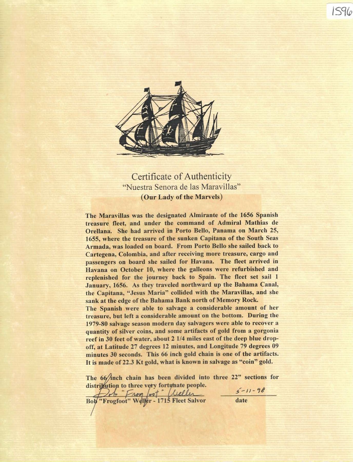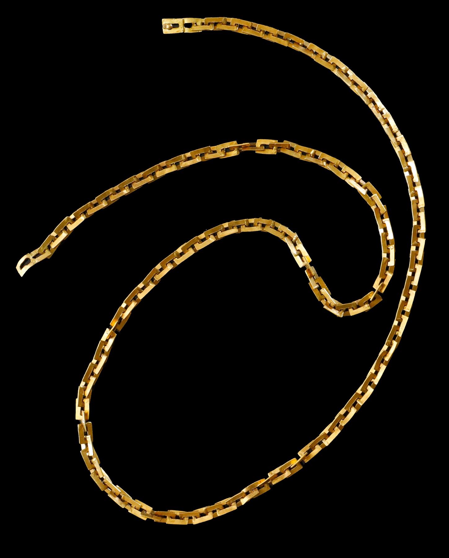 Elegant rectangular-link gold chain, 23.86 grams total, fineness 20K, ex-Maravillas (1656), ex-Weller, ex-Barfield. 22" long. Not your typical "money chain" (a 17th century form of tax evasion), this is a dainty chain of unique design, consisting of 146 flat, thin, rectangular links of rich-colored, high-karat gold (XRF tested at 20K), once part of a 66"-long chain found on the wreck in 1979-80 and divided into three necklaces of 22" each, with two links at each end joined to make a sort of clasp (no modern material), not overly secure but functional, thereby making a wearable artifact from one of the richest treasure wrecks to be salvaged in our time. From the Maravillas (1656), with photo-certificate from Bob "Frogfoot" Weller, pedigreed to the Barfield Collection.