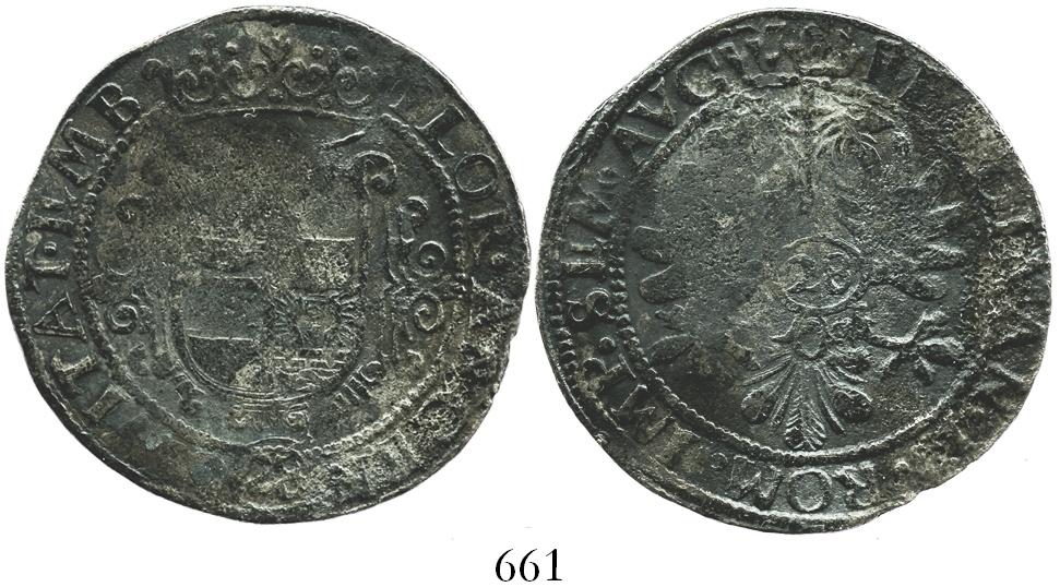 Emden, Germany (Holy Roman Empire), 28 stuber (2/3 thaler or 1 gulden), Ferdinand II (1624-37). KM-10.1. 16.8 grams. Big, round coin with two-headed Habsburg eagle with denomination 28 in its breast on one side, crowned arms on reverse, all details clear through a haze of dark toning and oxidation (uncleaned). With Sedwick certificate. From: Lastdrager, sunk in 1653 off the Shetland Islands, north of Scotland