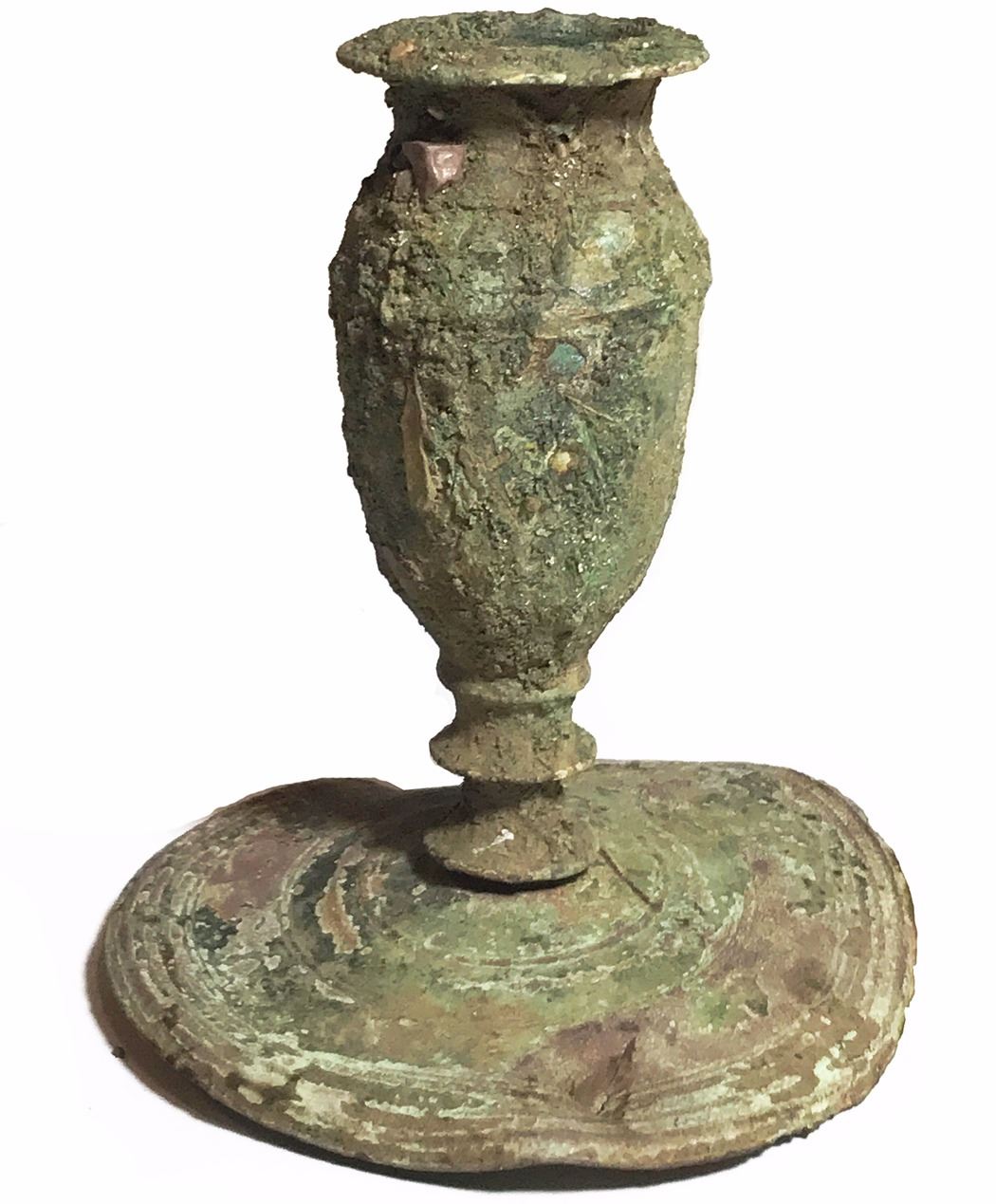 Encrusted brass/copper candlestick holder, Spanish colonial, 1500s-1600s. 379 grams, 5" tall with 4-1/2" drip tray. Two solid pieces of a candlestick holder with much encrustation and green patina. Both are complete and well preserved.
