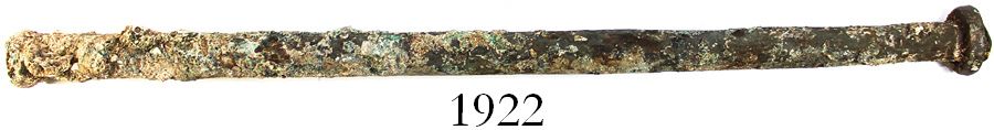 Encrusted copper hull-pin. 2510 grams; 23" long. Long, straight, bolt with washer frozen at one end, most of the surface thickly encrusted with white and green. Not much is known about this French ship except that she had fought for the United States in the Revolutionary War and was not carrying treasure when she sank. With photo-certificate. Recovered from: Tounant, sunk in 1779 off Cape Francois, Hispaniola