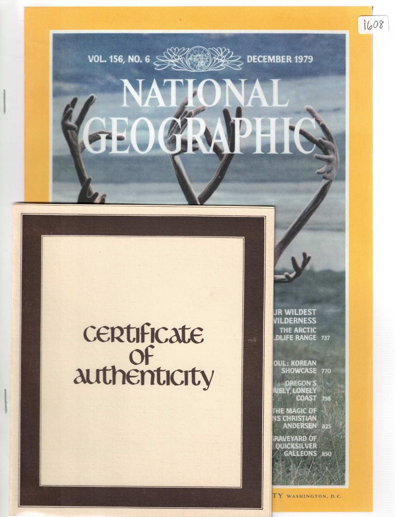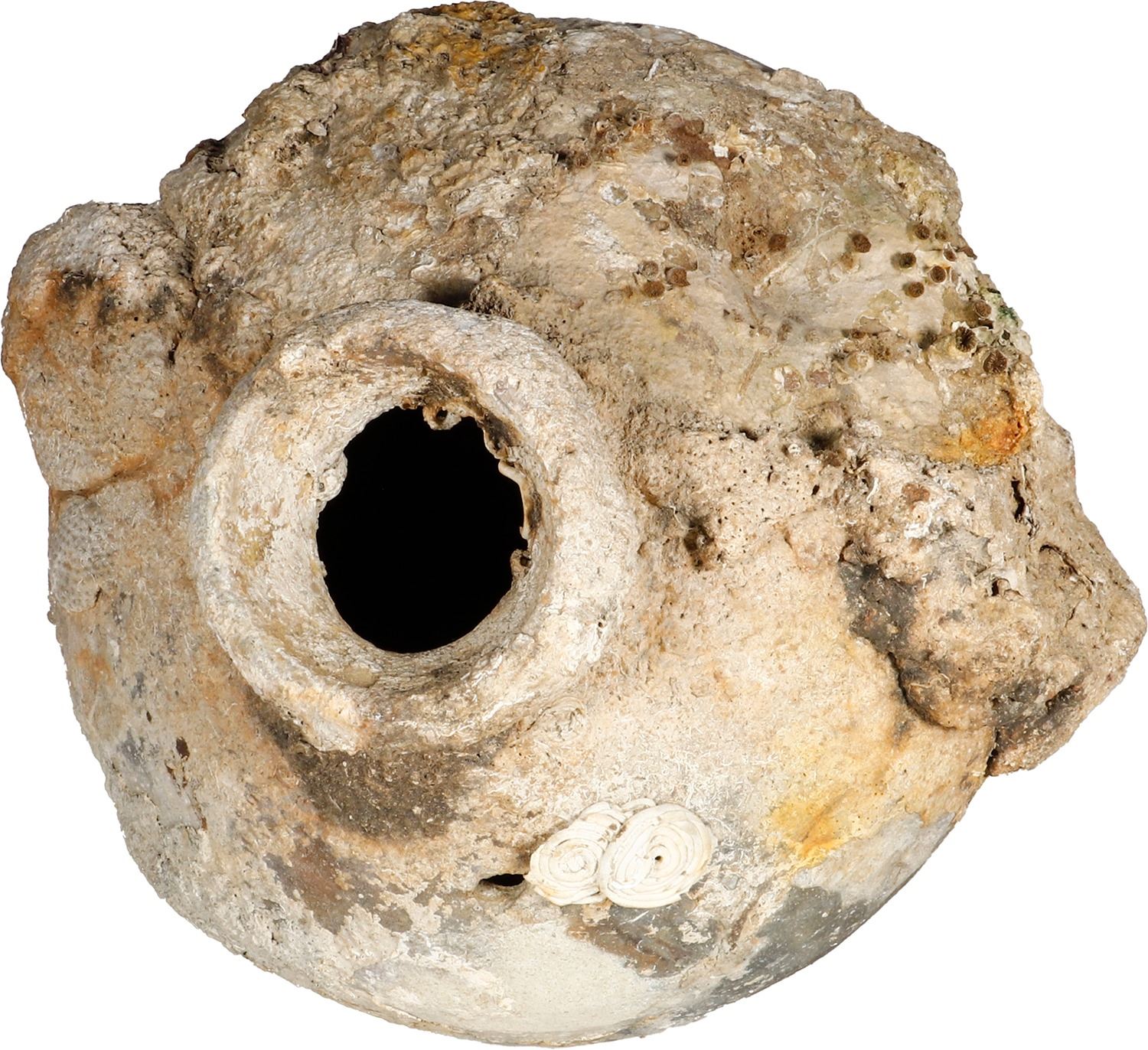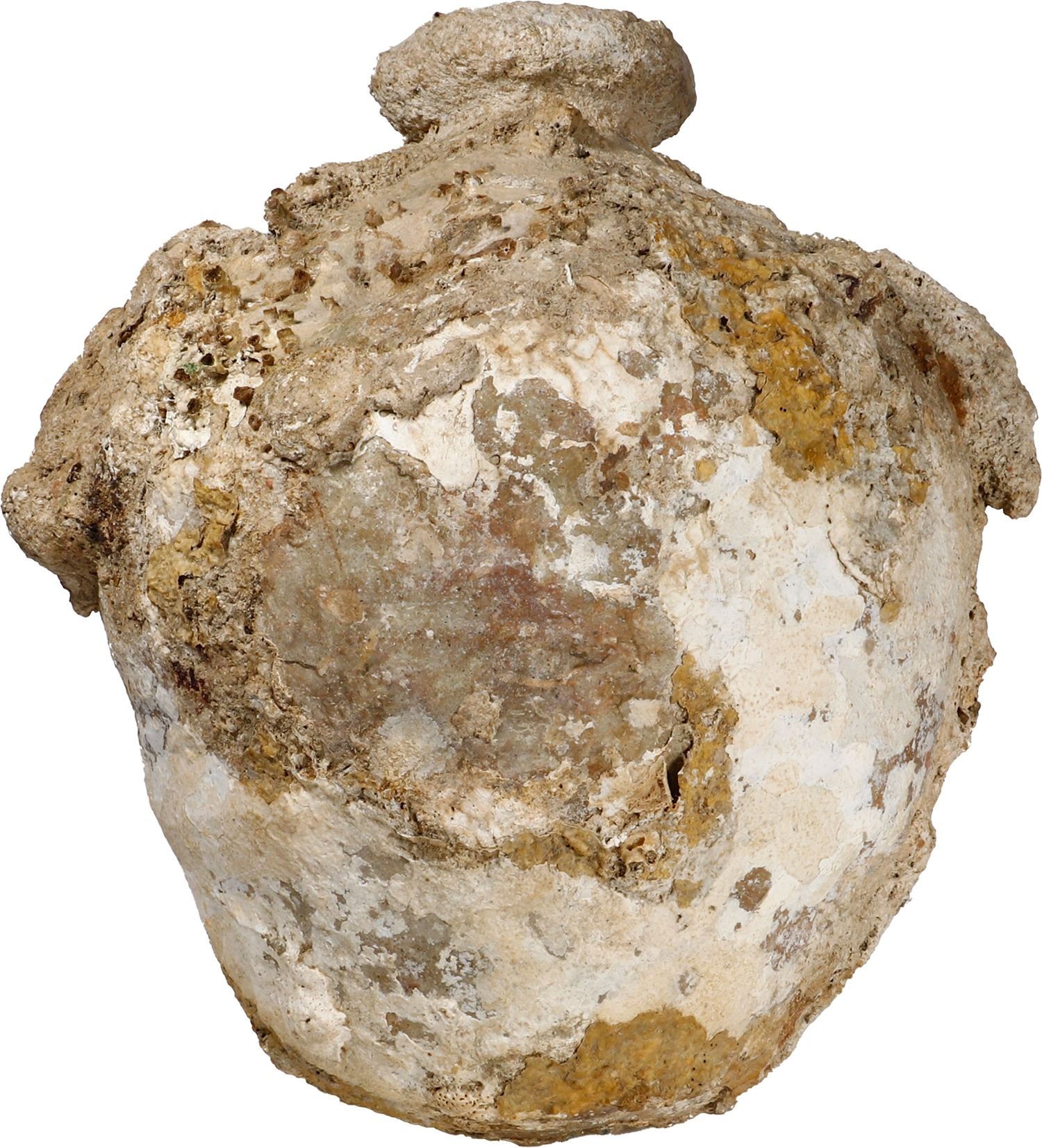 Encrusted earthenware "olive" jar, ex-Guadalupe-Tolosa (1724). 6.2 lbs (2819 grams) total. Roughly 12" tall; 8" in diameter at shoulders. Beehive olive jar with rounded bottom, intact except for one small hole at shoulder, large rolled lip, almost completely encased in encrustation with a few large chunks of coral and worm rings around half of the shoulder. Pick up recommended; special shipping costs apply. From Guadalupe-Tolosa (1724), with original certificate from Captain Tracy Bowden through his contract with the Dominican Republic and copy of the article "Graveyard of the Quicksilver Galleons" by Mendel Peterson from the December 1979 issue of National Geographic signed by Bowden.