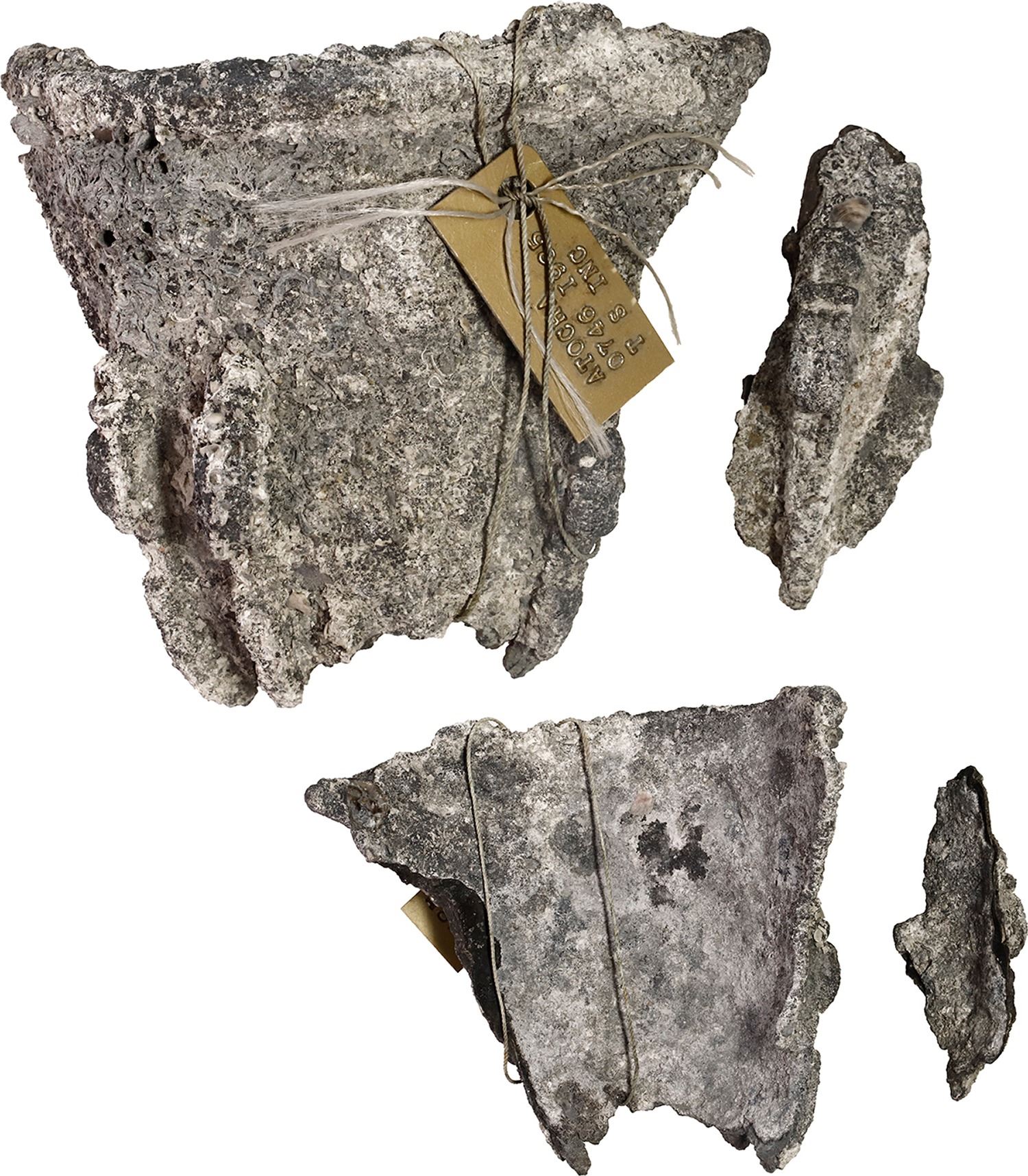 Encrusted silver bowl fragments (two), ex-Atocha (1622), ex-Lippman. 220 grams total. 4" x 4½" and 3" x 1¼". Decent-sized portion of a large, tapered decorative bowl or urn plus small shard from another part, all dark gray overlain with lots of encrustation. From the Atocha (1622), with original plastic tag and Fisher photo-certificate 85A-A360 (1435), housed in display box, pedigreed to the Noel Lippmann Collection.