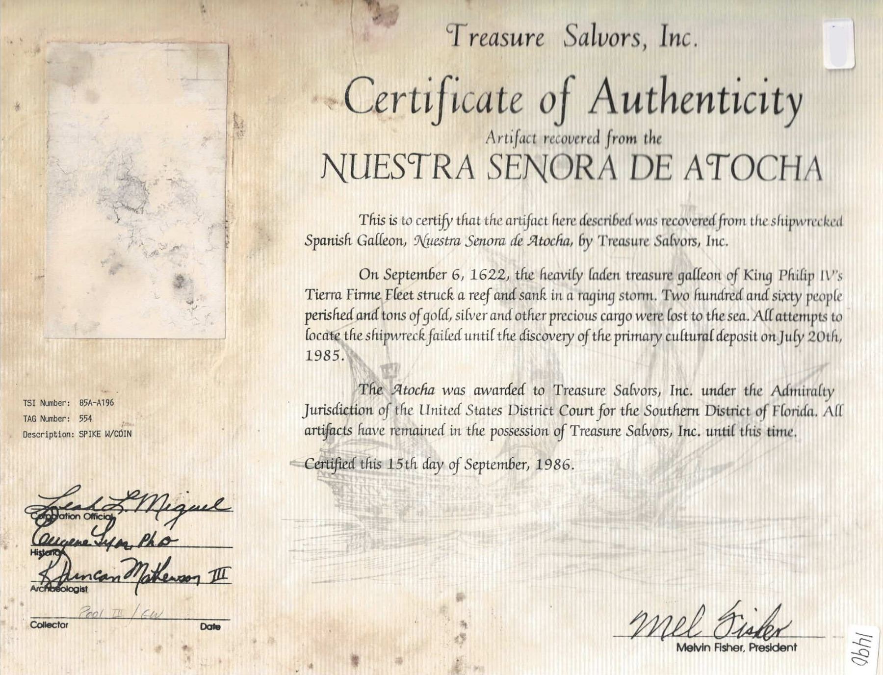 Encrusted spike and coin, ex-Atocha (1622). 339 grams total. Roughly 9" long. Intact, conserved iron spike peeking out under a cocoon of light brown shells and coral, an encrusted large round coin serendipitously attached at the bottom of the spike. From the Atocha (1622), with original Fisher photo-certificate (water damaged) 85A-A196.