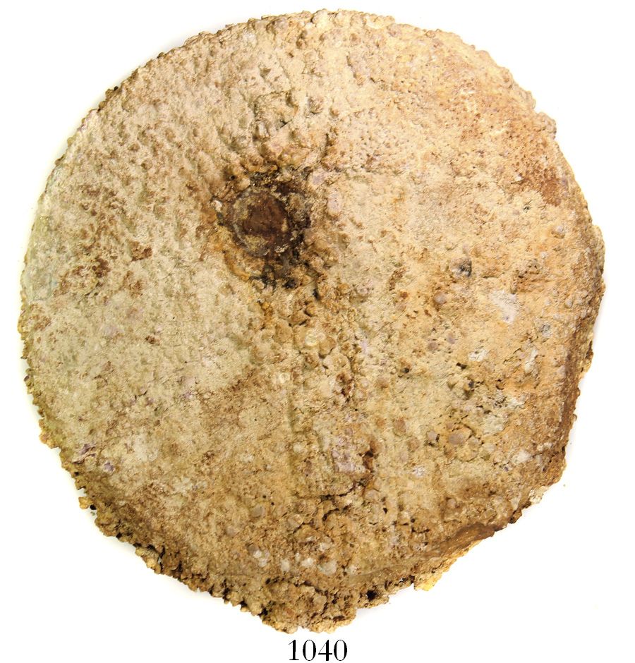 Encrusted stone grinding wheel. 5.29 kg, about 9" in diameter and 3" thick. A neatly shaped disk (probably used for sharpening blades) with entire surface covered in pebbly orange encrustation, a heavy and attractive conversation piece. From the mid-1500s "Pewter Wreck," with Global Marine Exploration photo-certificate #PC02526. Recovered from: "Pewter Wreck," sunk in the mid-1500s off Santo Domingo