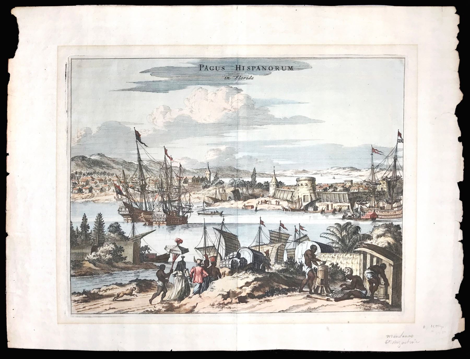 English copperplate engraving by Ogilby entitled "Pagus Hispanorum in Florida" (1671) showing a scene of St. Augustine, hand colored. 19" x 14-1/4" (image 15" x 11-3/8"). Large, colorized engraving by John Ogilby from his work America: Being the Latest, and Most Accurate Description of the New World, featuring a fanciful view of St. Augustine's fort, natives completing tasks, with mountains in the background. In very good condition with page fold in the middle and ragged side edges not affecting image at all.