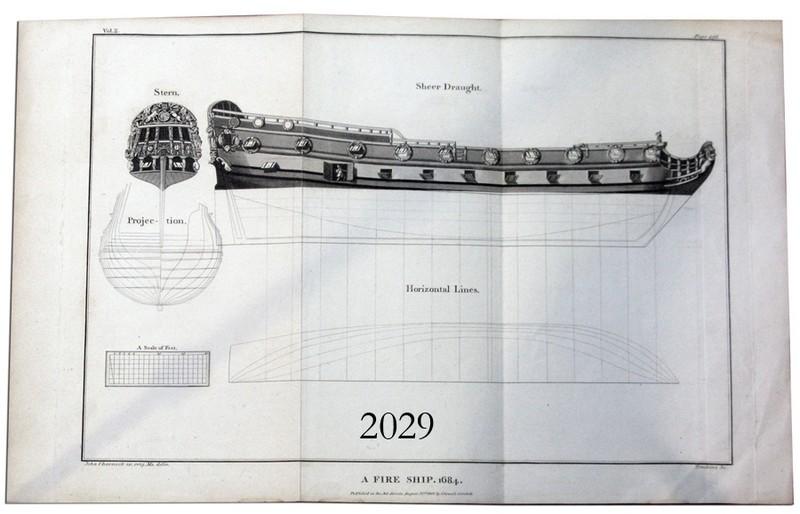 English engraving, 1801, by Charles Tomkins, printed by J. Sewell (Cornhill), entitled "A Fire Ship 1684" and showing the side and rear views and ribbing of the ship. 18-1/4" x 11-1/2". A combination of technical drawing and artistry, with folds as taken from a book but otherwise in excellent condition.