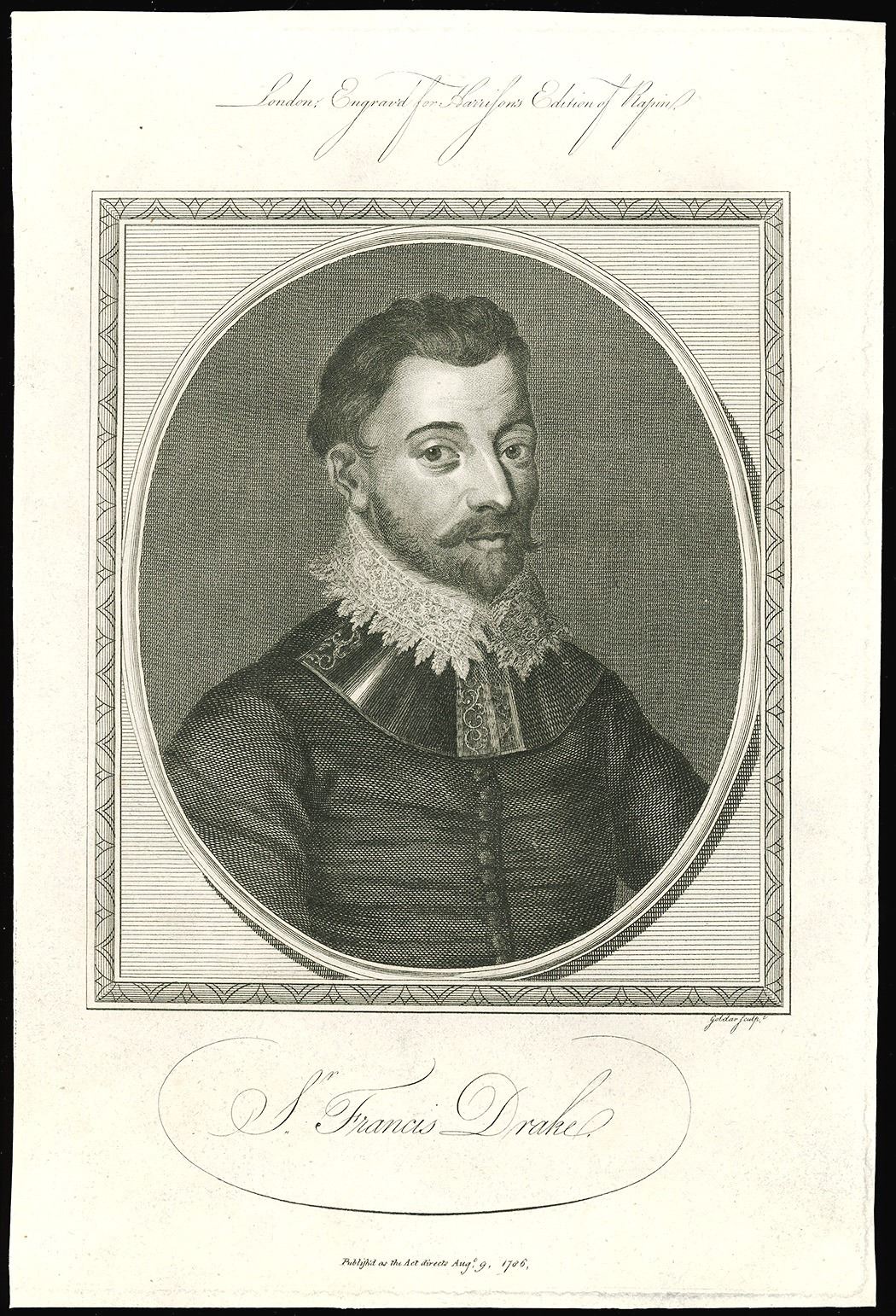 English intaglio engraving of Sir Francis Drake, dated August 9, 1786 (London). 11-1/2" x 7-1/2" (image size 7" x 6"). Familiar line drawing by engraver John Goldar of London of Sir Francis Drake for Harrison's Edition of Rapin’s History of England, by Paul Rapin de Thoyras (1787), on heavy paper in excellent condition.
