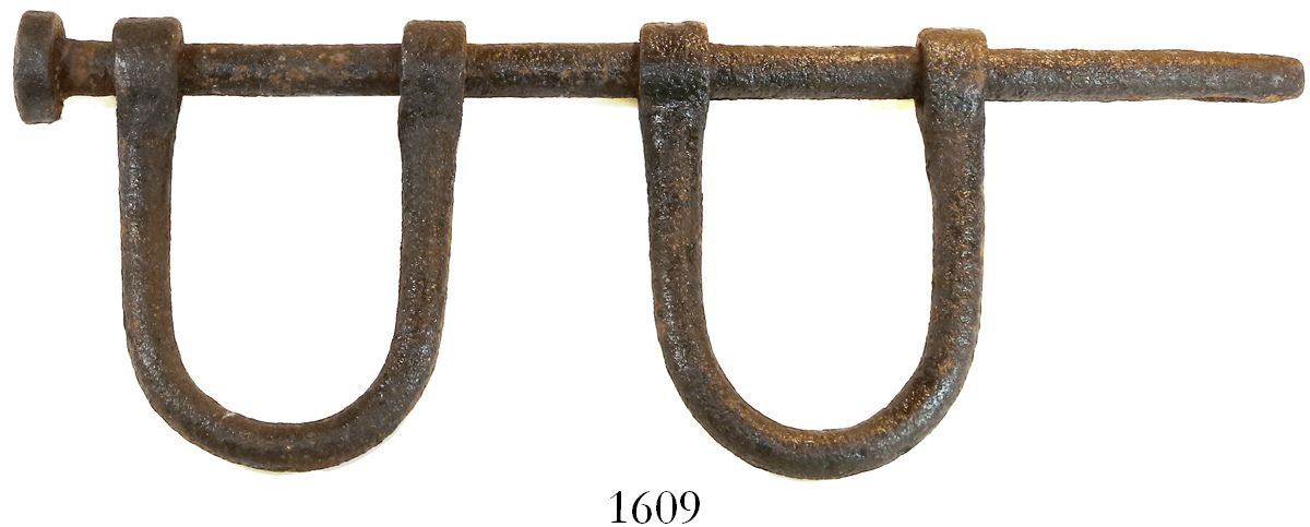 English iron shackles, 1700s. 722 grams, 12" long. Early straight-arm shackles used to transport slaves and prisoners, the metal pitted (as-found condition) but intact and solidly constructed, found in England. With photo-certificate.