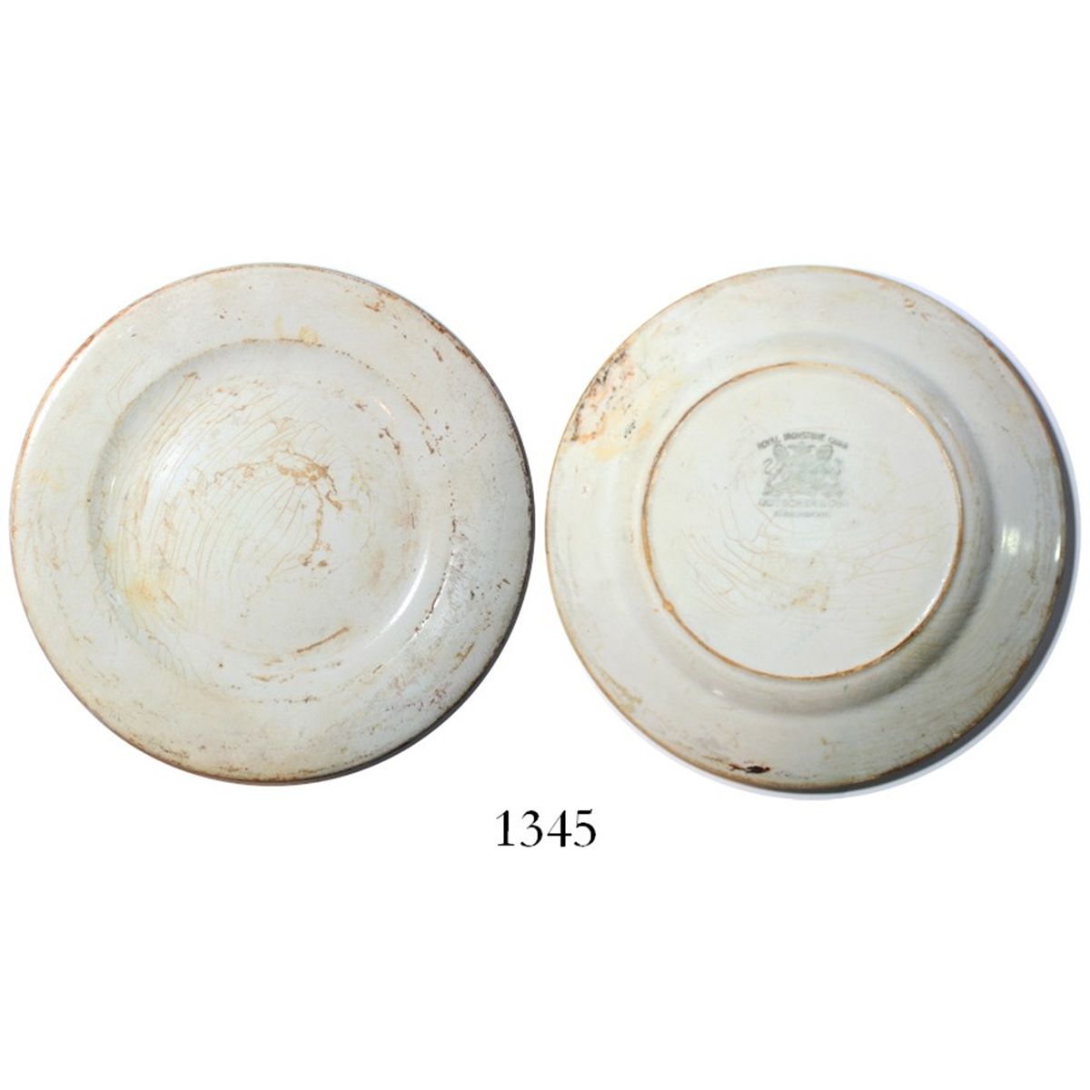 English ironstone plate, Gotscher & Co. 485 grams, 8" in diameter and 1" tall. A plain-white glazed dish marked on the bottom with ROYAL IRONSTONE CHINA above and GOTSCHER & Co. / BIRMINGHAM below double-lion arms, perfectly intact with minor crazing inside the glaze, the maker better known for silver than china. Pedigreed to the Marty Meylach collection. Recovered from:Lugana, sunk in the late 1800s in the Florida Keys