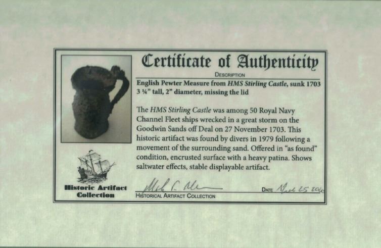 English pewter measure, intact but missing lid, ex-HMS Stirling Castle (1703). 212 grams, 3-1/4" tall, 2" diameter. The Great Storm of November 1703 in southeast England wrecked over 50 ships, many on the Goodwin Sands, including the Royal Navy channel fleet which included the HMS Stirling Castle. This lovely, encrusted vessel shows saltwater effects and small losses of metal but is in stable condition and makes for a very displayable artifact. From the HMS Stirling Castle (1703), with photo-certificate.