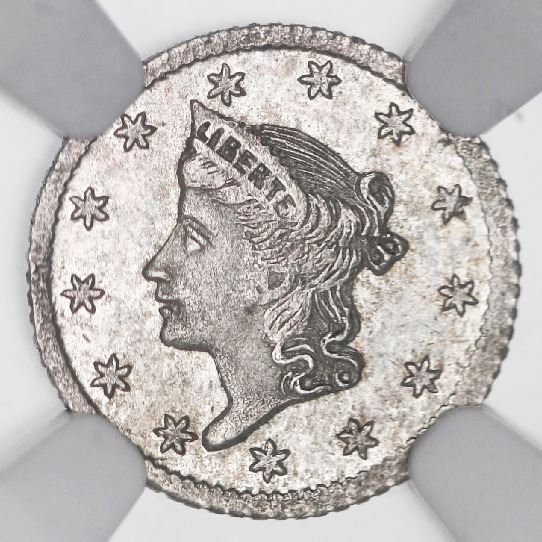 Entre Rios, Argentina, 1/2 real-sized baptismal token, no date (1867), NGC MS 65, finest and only example in NGC census. Janson-unl (mule of CJ-3 and CJ-5). Rare muling of two different Entre Rios token designs of 1867: the obverse from a merchant token "monedas circulante" clearly imitative of the US gold dollar design of 1849-54 by James B. Longacre and the reverse from a baptismal token. Brilliant lustrous and mark-free surfaces with speckles of gold toning. NGC #4768054-001 (note: chip in bottom of slab).