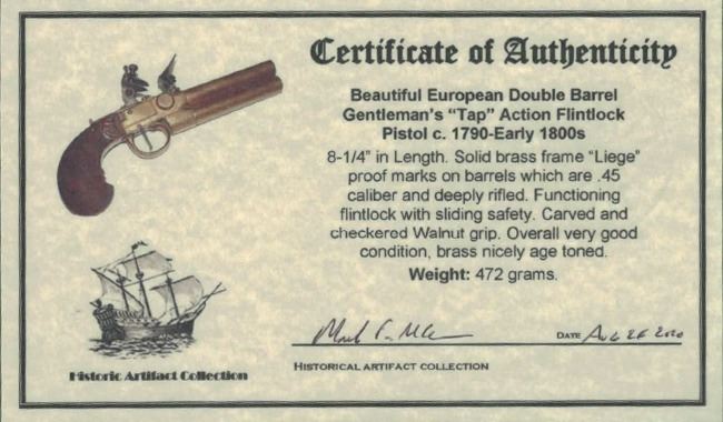 European double-barrel gentleman's "tap" action flintlock pistol, ca. 1790-early 1800s. 472 grams, 8-1/4" long, 4-1/4" barrel. Very attractive small pistol with solid brass frame made of two deeply rifled, round .45-caliber barrels, Liege proof mark and carved and checkered walnut grip, functioning flintlock with sliding safety. With photo-certificate.