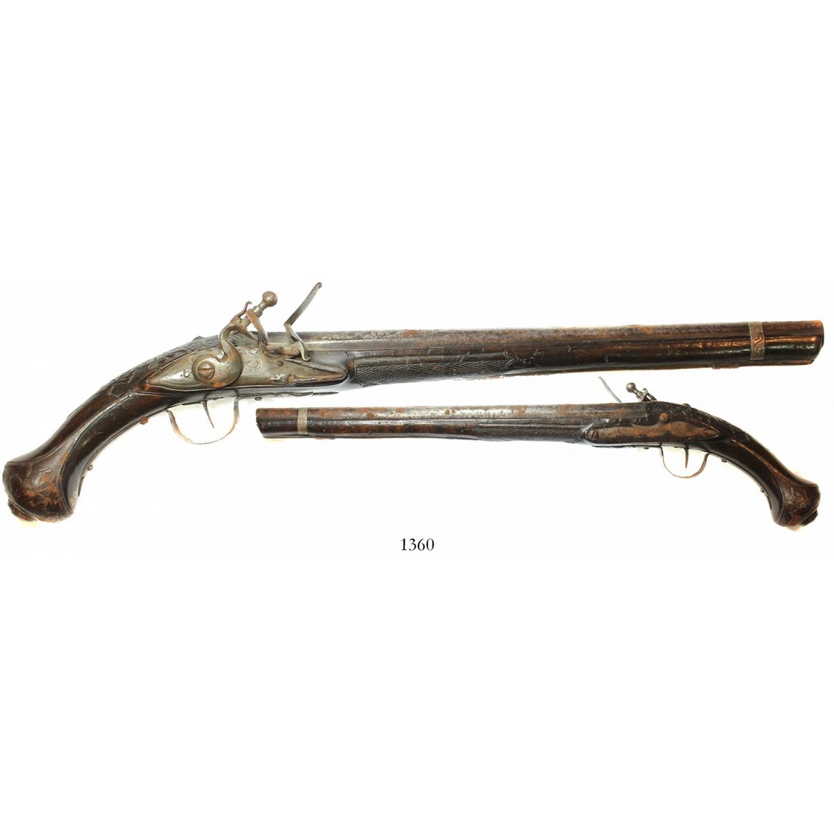 European flintlock pistol, 1700s, ornately carved stock. 946 grams, 21" long. Ornate round barrel with silver strap at bore, lightly engraved lock, somewhat ornate trigger-guard, sideplate and buttplate, false ramrod, dark wood with light carving, the steel parts with rusty spots.