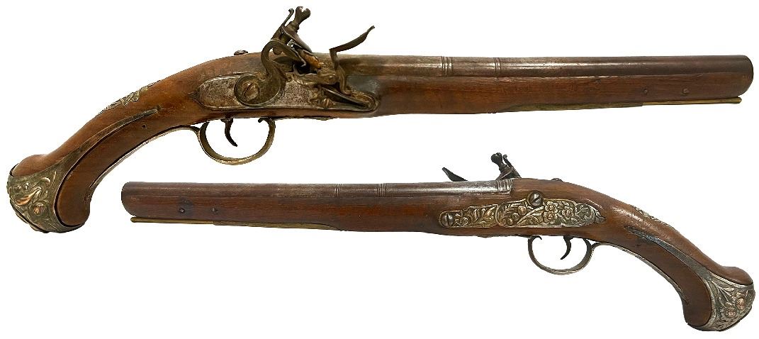 European flintlock pistol, 1700s. 820 grams, 17" long, 10-1/2" tapered barrel. Silver-mounted .68 caliber pistol with ring-turned decor, ornate cast silver mounts with relief decorations on buttcap and walnut stock, ramrod in stock, working S-form hammer, overall good condition and age toned. With photo-certificate.