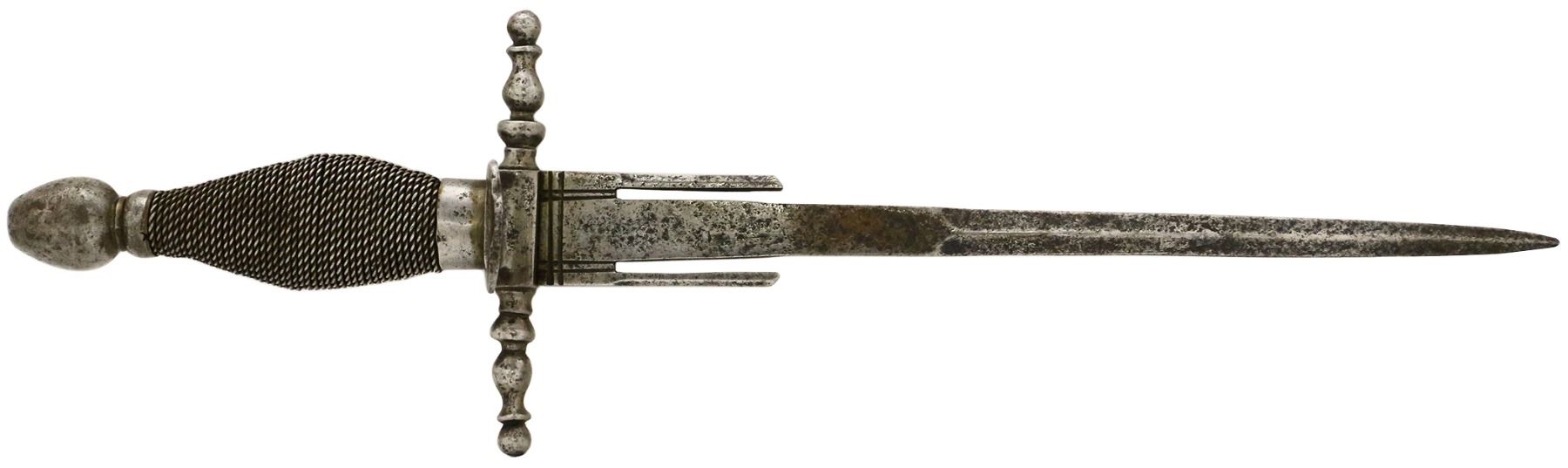 European "left hand" dagger, 1700s. 171 grams, 11-1/2" long, 7-1/2" blade. Designed to parry or block an opponent's attack, the "left hand" dagger was a standard part of combat, this one beautifully preserved with intact double-edged blade of unusual design, ornately designed straight crossguard, rounded pommel, grip made of twisted iron wire, and simple ring guard, all made of iron.