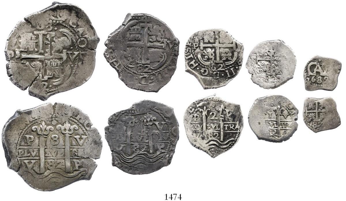 Exceptional denomination set of 8-4-2-1-1/2 reales dated 1682V. S-P39. 27.8, 13.5, 7.1, 3.9 and 1.8 grams. The three higher denominations in this set are choice, with bold details and pleasing toning, the 1/2R with 2 dates and the 1R round and high grade (also with 2 dates), none in this set lower than VF, a very difficult set to put together but each coin could stand on its own if split up.